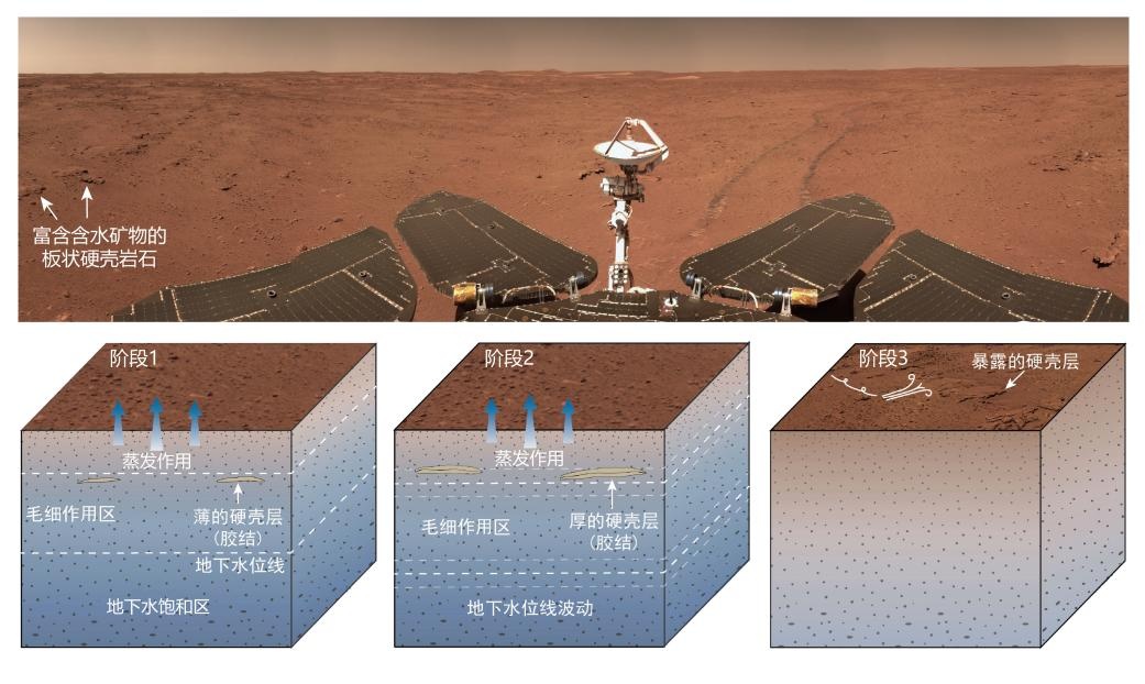 △祝融号在着陆区发现富含含水矿物的板状硬壳岩石及其在地下水作用下的形成过程示意图