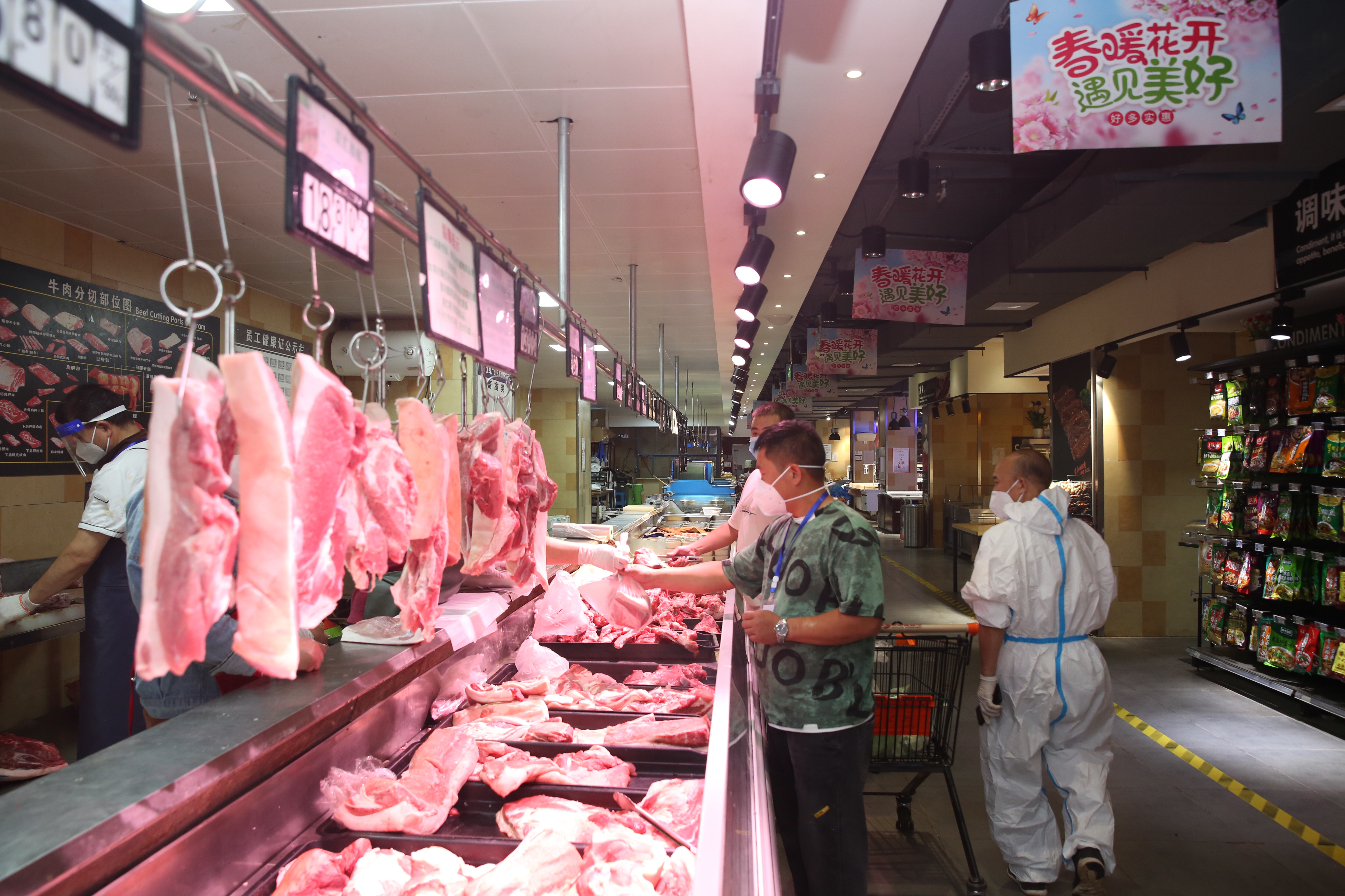 5月18日,邻水县世纪隆超市(东方店)内,市民正在挑选购买猪肉。 摄影 兰林前