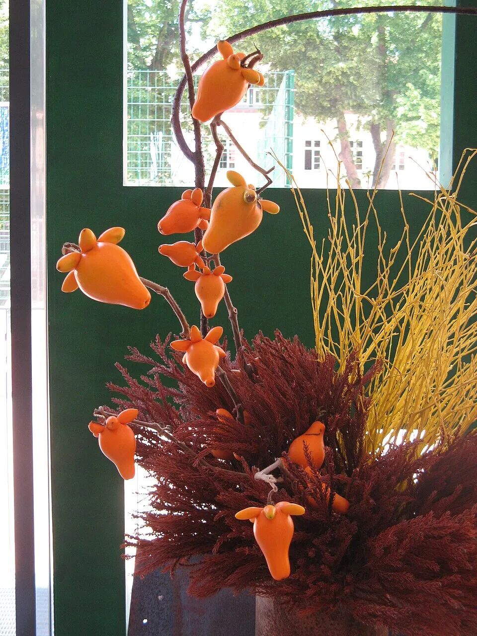 市场上出售的乳茄,看上去硕果累累,格外繁茂,实际上自然生长的乳茄果实并没有这么密集。原来,用来出售的观赏乳茄都是商家提前将果实剪下来,固定在底座上做出造型,再插上其它植物的绿叶做出来的。为什么不直接用乳茄自身的叶片?这是因为,乳茄的茎和叶子表面都长着黄色的针状尖刺,虽然较为稀疏,但仍有把人刺伤的可能性。而且,它的叶子观赏性也不太强。