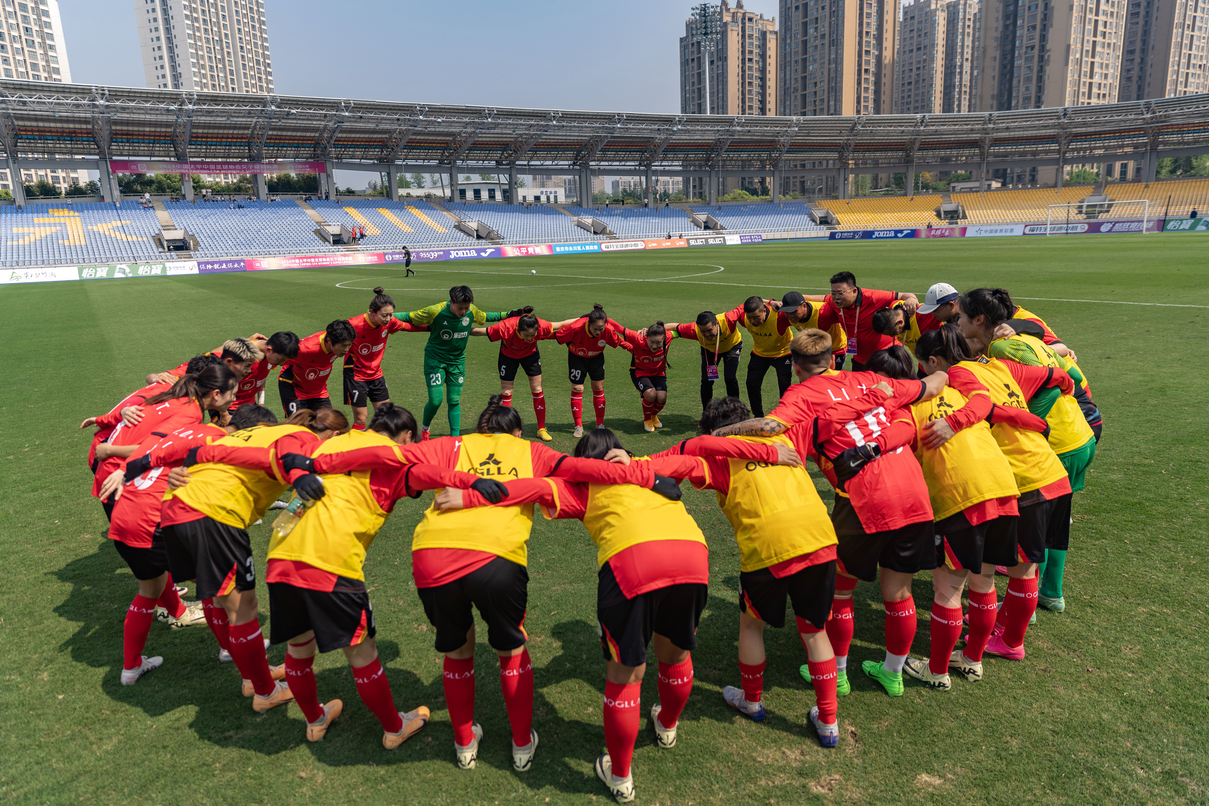 4月13日,永川茶山竹海橙狮女足队在比赛前加油。新华社记者 黄伟 摄