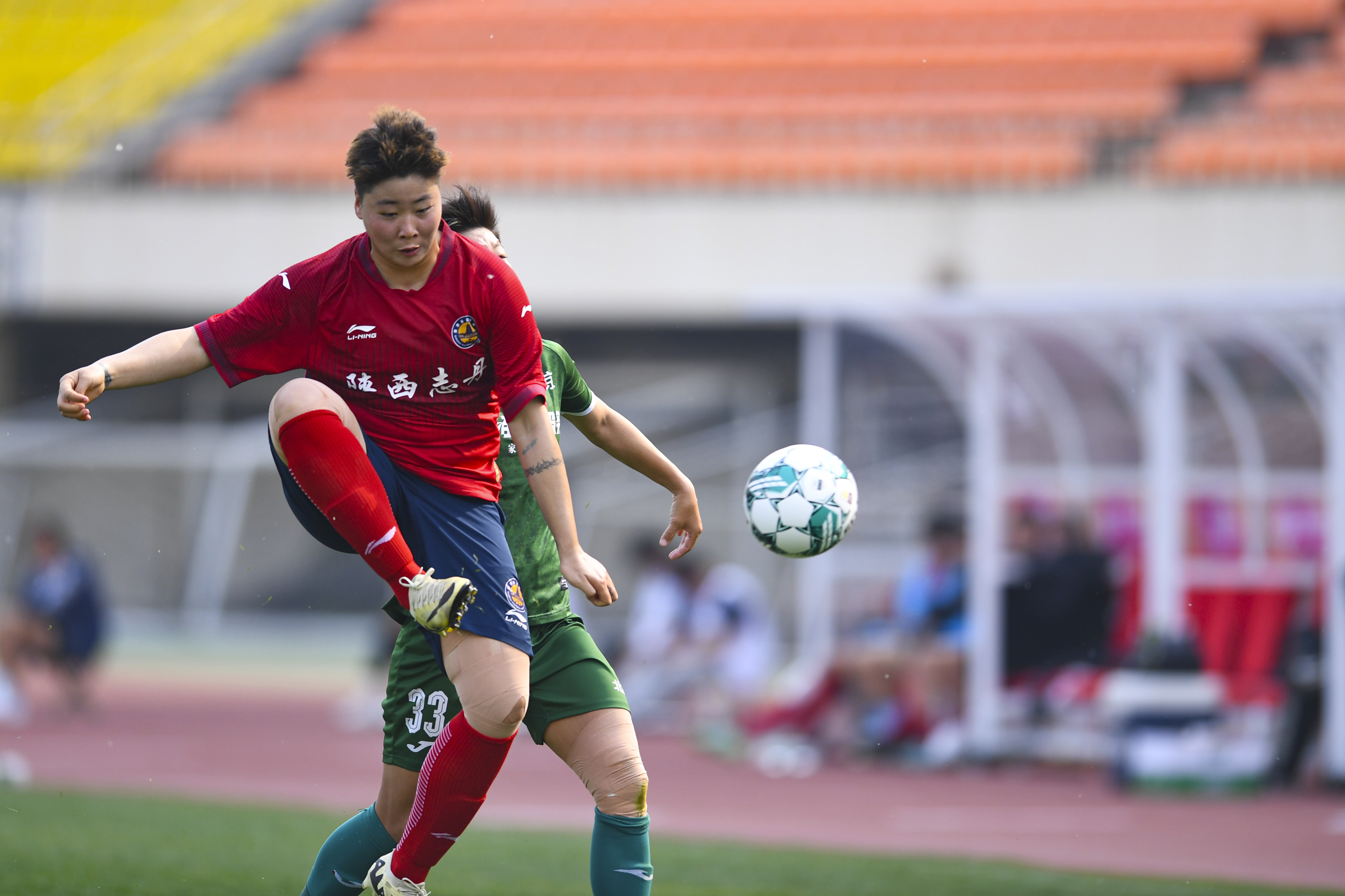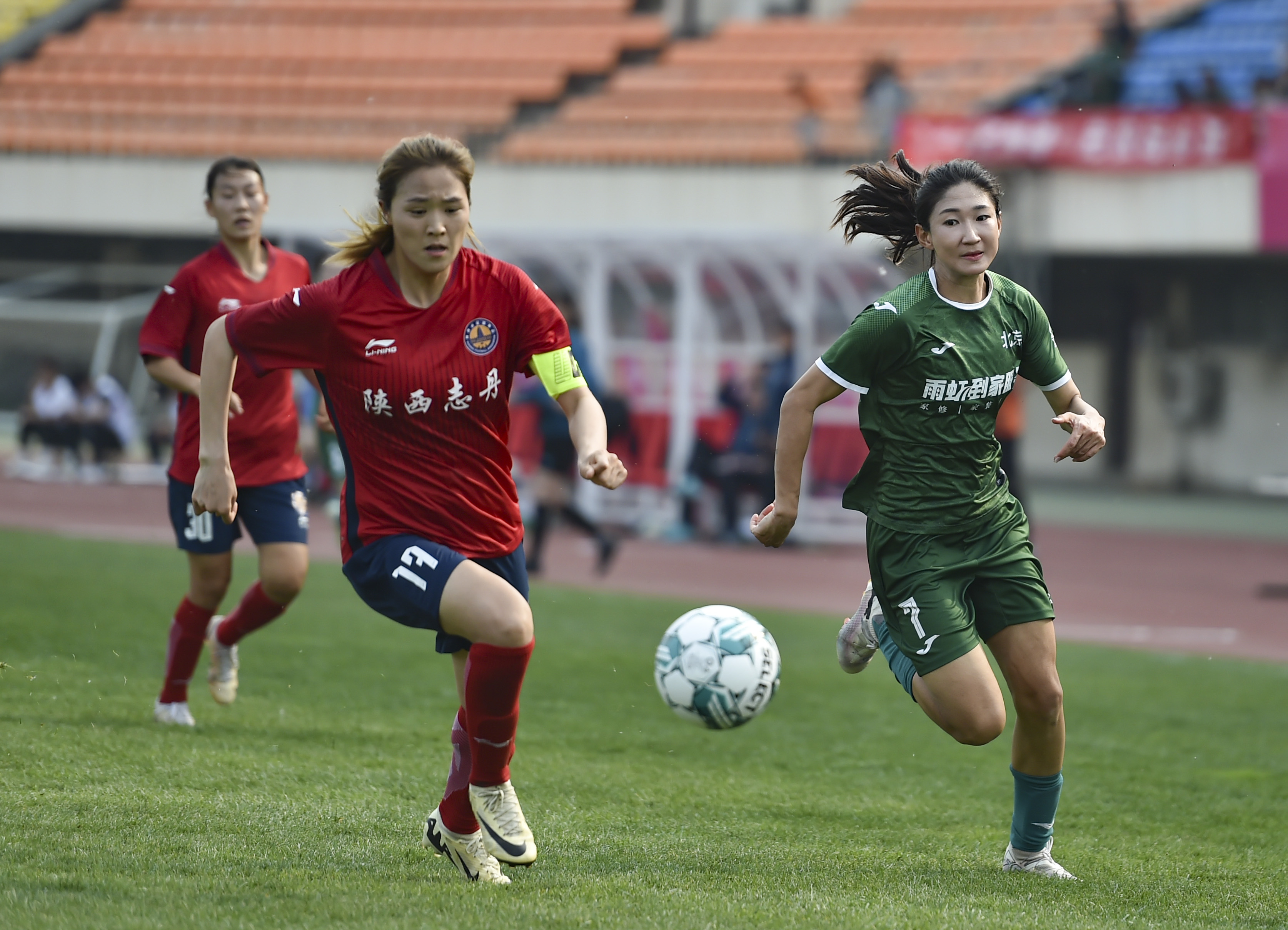 4月13日,陕西志丹女足队球员赵美佳(前)和北京雨虹修缮女足队球员王欢在比赛中拼抢。新华社发