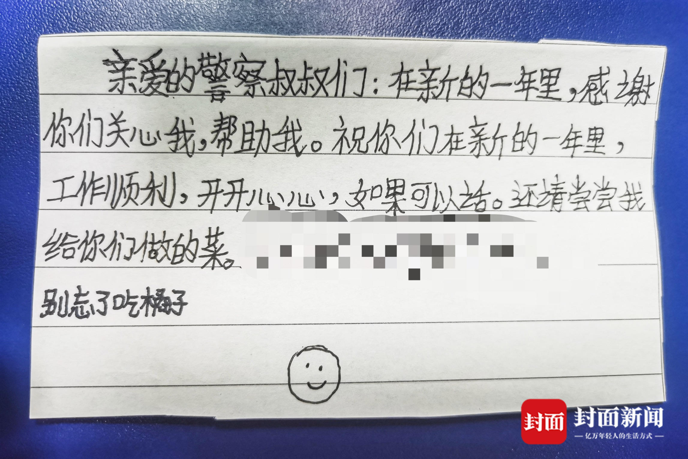 新春佳节将至,成都市新都公安分局新都派出所的民警收到一份特别的礼物。男孩小洋(化名)将一封手写的感谢信、一盘土豆丝、一袋橘子送到了值班民警手中。