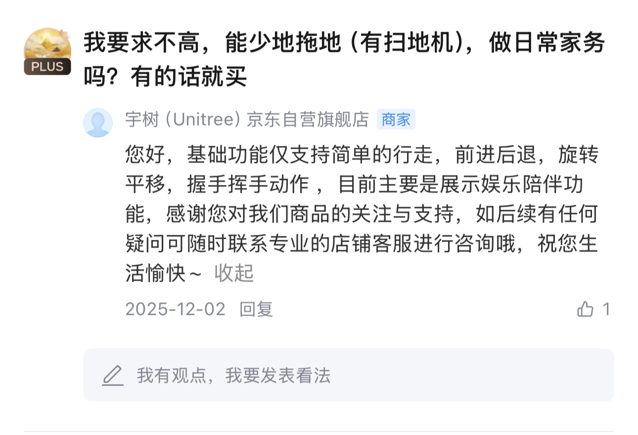记者注意到在宇树科技官方店铺里,售价2.9万元的R1已售超百单,而售价8.5万元的G1机器人24小时内热度飙升4人付款,而销售人员对记者表示,此款并非春晚表演款,“型号功能的话没有一样的,然后推荐您购买G1 EDU 功能需要看您二次开发的情况。”销售人员表示,二次开发是已有机器人产品的基础上,通过编写新的应用程序、添加额外的传感器和设备等方式,对机器人进行个性化的功能扩展,以满足特定用户需求或实现特定功能。 如果不进行二次开发,此款机器人基础功能仅支持简单的行走,前进后退,旋转平移,握手挥手动作,目前主要是展示娱乐陪伴功能。