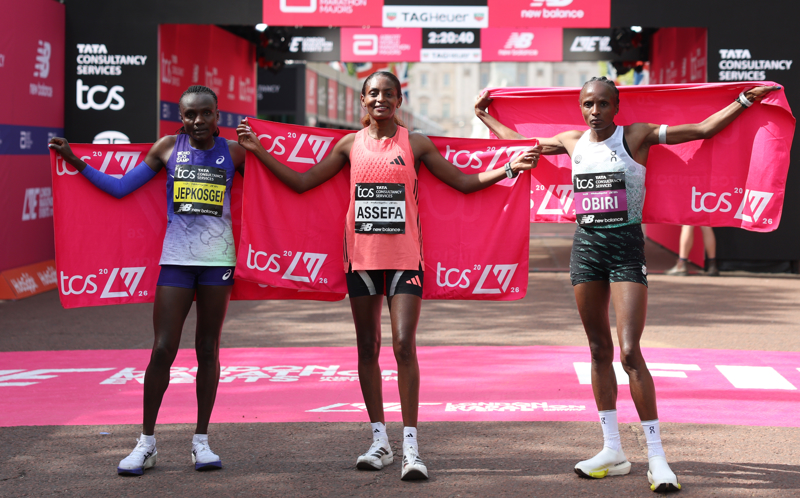 4月26日,冠军埃塞俄比亚选手阿塞法(中)与亚军肯尼亚选手奥比里(右)、季军肯尼亚选手杰普科斯盖在赛后合影。 当地时间4月26日,在2026伦敦马拉松女子精英组比赛中,埃塞俄比亚选手阿塞法以2小时15分41秒的成绩成功卫冕,并将自己去年创造的纯女子马拉松世界纪录提升了9秒。 新华社记者 李颖 摄