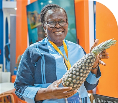 在第八届进博会国家综合展上,贝宁国家馆的工作人员展示贝宁奶油菠萝。 王 初摄(人民视觉)