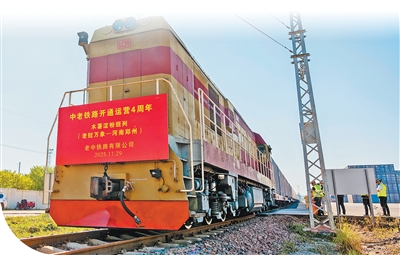 11月29日,一列满载1000吨木薯淀粉的铁路集装箱班列从中老铁路万象南站驶出,准备发往河南郑州。这是老挝首次成列运输输华的木薯淀粉。 凯 乔摄(新华社发)
