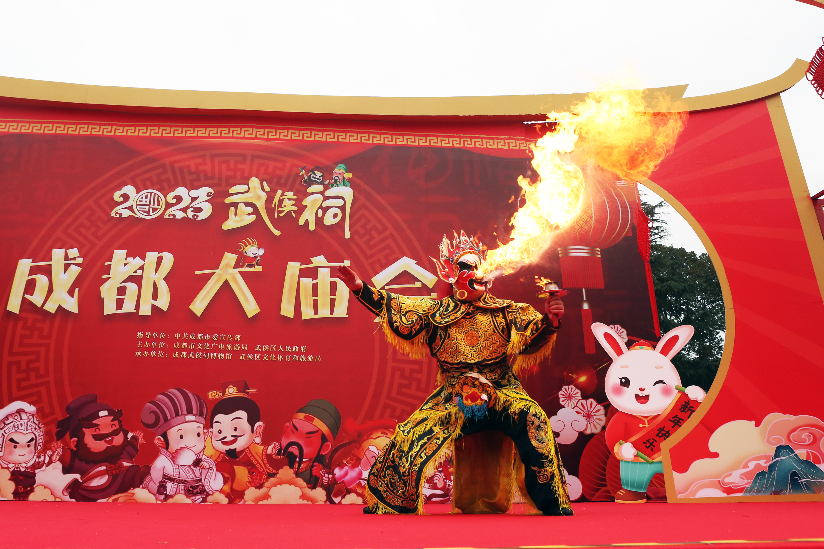 大年初一至初六,国粹京剧、川剧、舞蹈民乐等一系列精彩的文艺演出在成都武侯祠博物馆西区荐馨殿广场轮番上演。汇集多个京剧经典唱段的戏曲联唱,各具韵味;作为天府之国看家绝技的变脸吐火,深受欢迎;精心编排的舞蹈婉约动人,在庙会舞台上徐徐展开一幅生动美好的蜀风画卷,绚丽呈现天府文化的悠久灿烂。