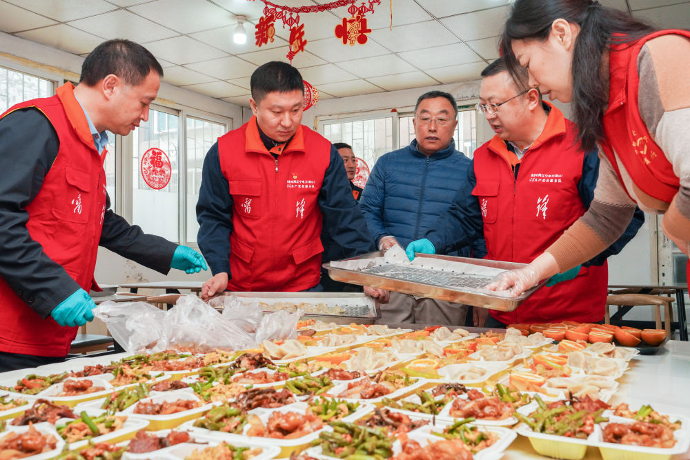 国网鞍山供电公司雷锋共产党员服务队在与郭明义(左三)一起为公益餐厅送餐。(国网鞍山供电公司供图)