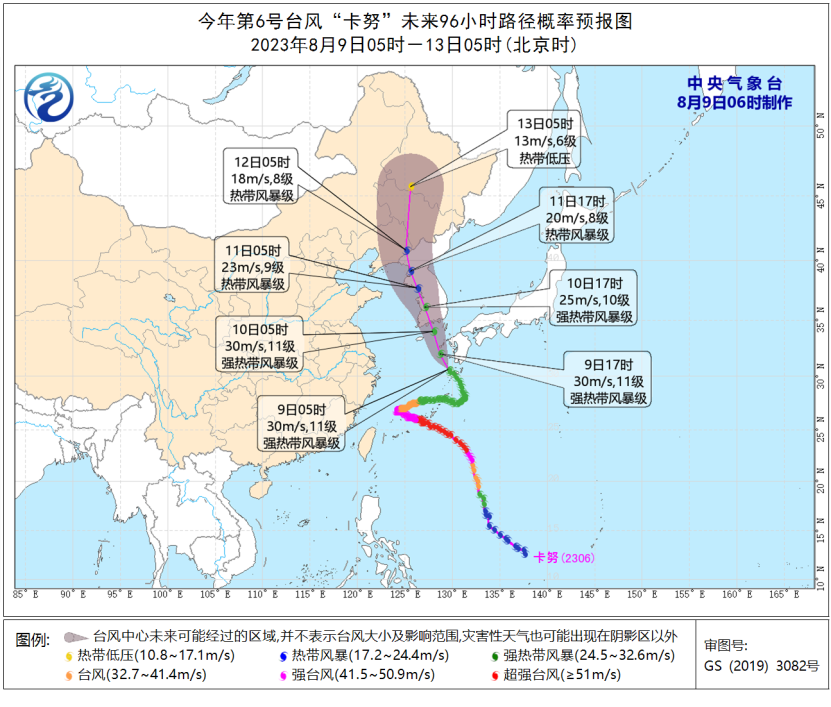 中央气象台预计,9日14时至10日14时,渤海东部、渤海海峡、黄海大部海域、东海东部海域将有6-7级、阵风8-9级的风,其中黄海中部和南部偏东海域、东海东北部偏东海域风力可达8-9级、阵风10-11级,“卡努”中心经过的附近海域风力可达10-11级、阵风12-13级,辽东半岛沿岸海域将有5-6级、阵风7级的风。