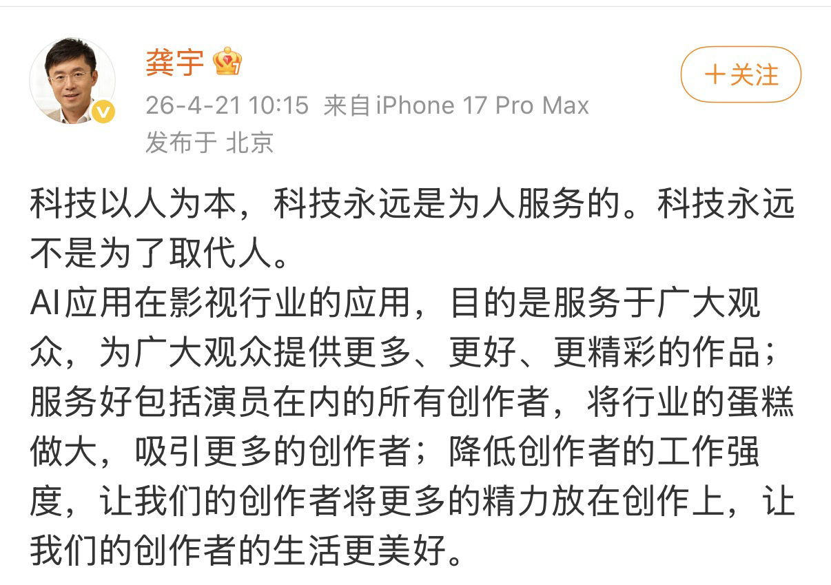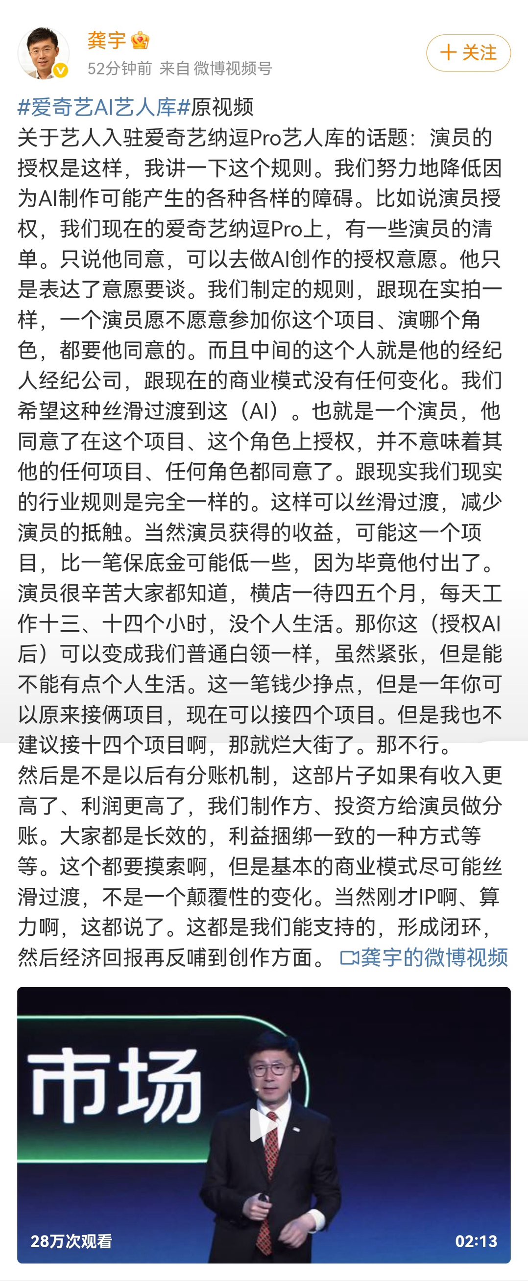 近期,关于爱奇艺推出AI艺人库及“纳逗Pro”系统的讨论持续发酵,多位艺人关于肖像授权的辟谣更将平台推上风口浪尖。 4月21日,爱奇艺创始人、CEO龚宇微博发文作出了详细回应。