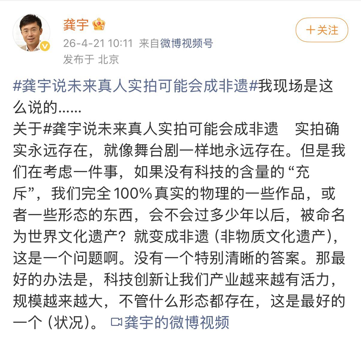 针对此前“真人实拍或成非遗”的言论引发的轩然大波,龚宇也进行了语境还原。他表示,实拍就像舞台剧一样将永远存在,但行业需要思考的是,随着科技渗透率越来越高,完全真实的物理实拍在未来是否会因稀缺而被赋予“世界文化遗产”般的特殊地位。
