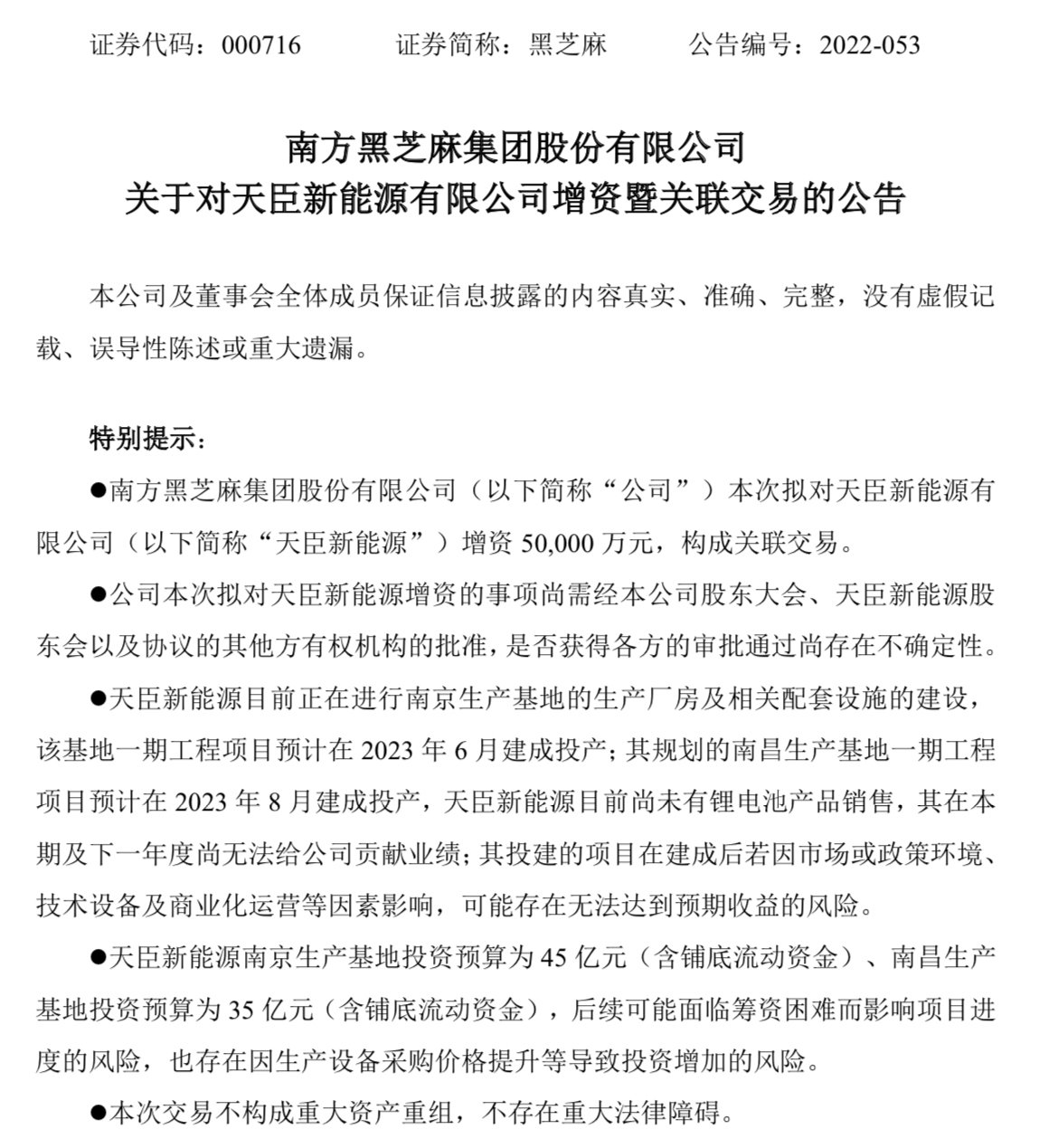 而根据昨晚黑芝麻发布的公告,此次增资是为抓住新能源的良好发展机遇,加快天臣新能源的业务发展,公司拟以全资子公司江西小黑小蜜食品有限责任公司100%股权作价、不足部分以自有资金补足,合计5亿元对天臣新能源增资。黑芝麻表示,本次增资后,拟同步在江苏南京市、江西南昌市建设磷酸铁锂电池生产基地,生产方形磷酸铁锂电池等系列产品,适应市场对储能锂电池的需求。