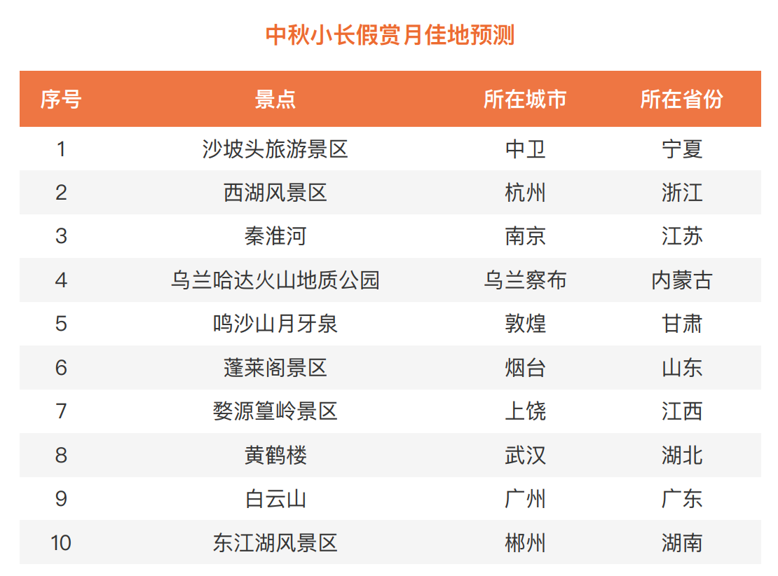 报告预测,宁夏中卫的沙坡头将凭借“赏月+观星”体验夺得中秋热门赏月目的地榜首,浙江杭州的西湖风景区则因“赏月+城市徒步”深受游客青睐。此外,秦淮河、黄鹤楼等充满传统⽂化韵味的市内景点也被年轻⼈列⼊中秋赏月必打卡目的地。