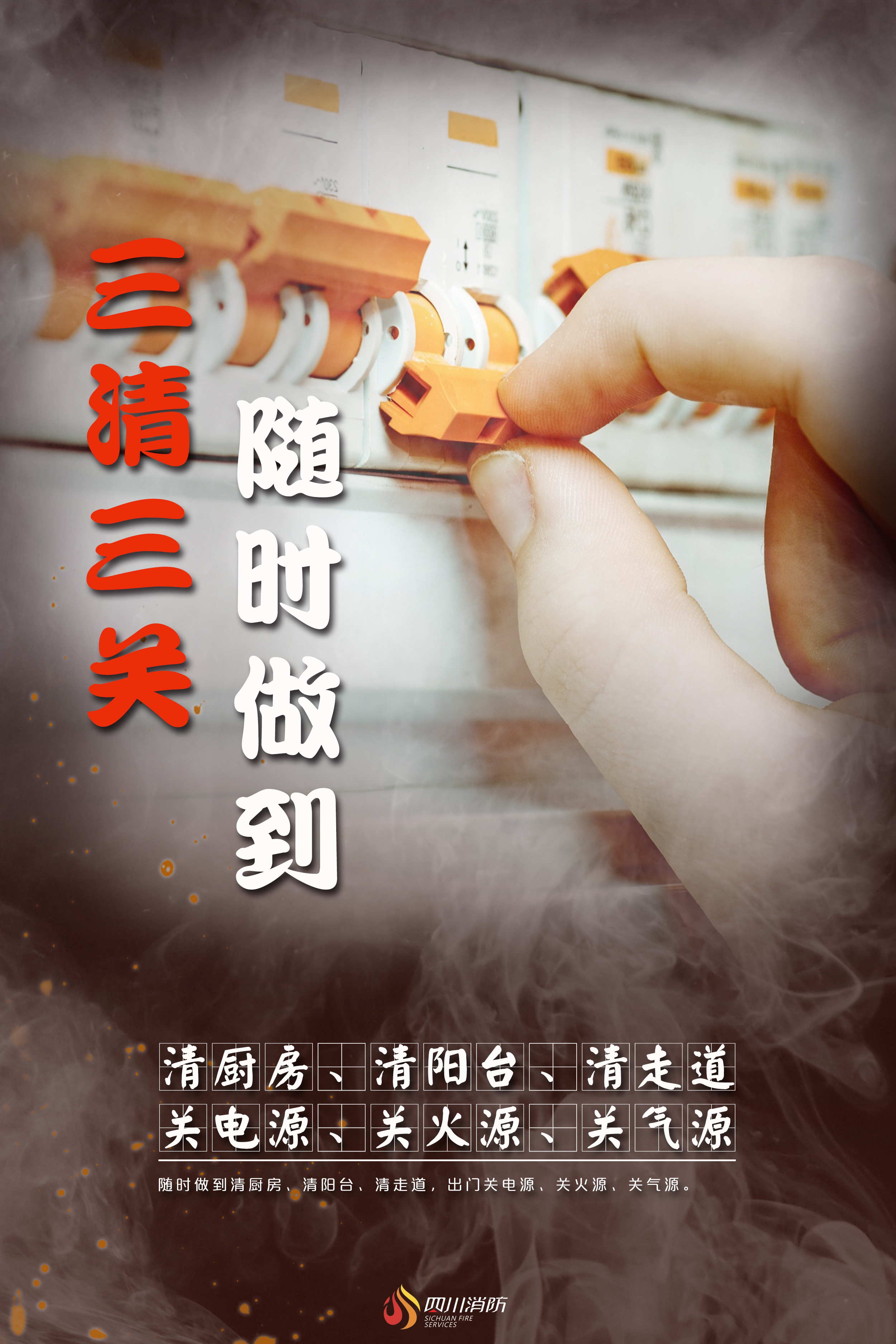 外出做到“三清三关”,清厨房、清阳台、清楼道,关燃气、关电源、关门窗。