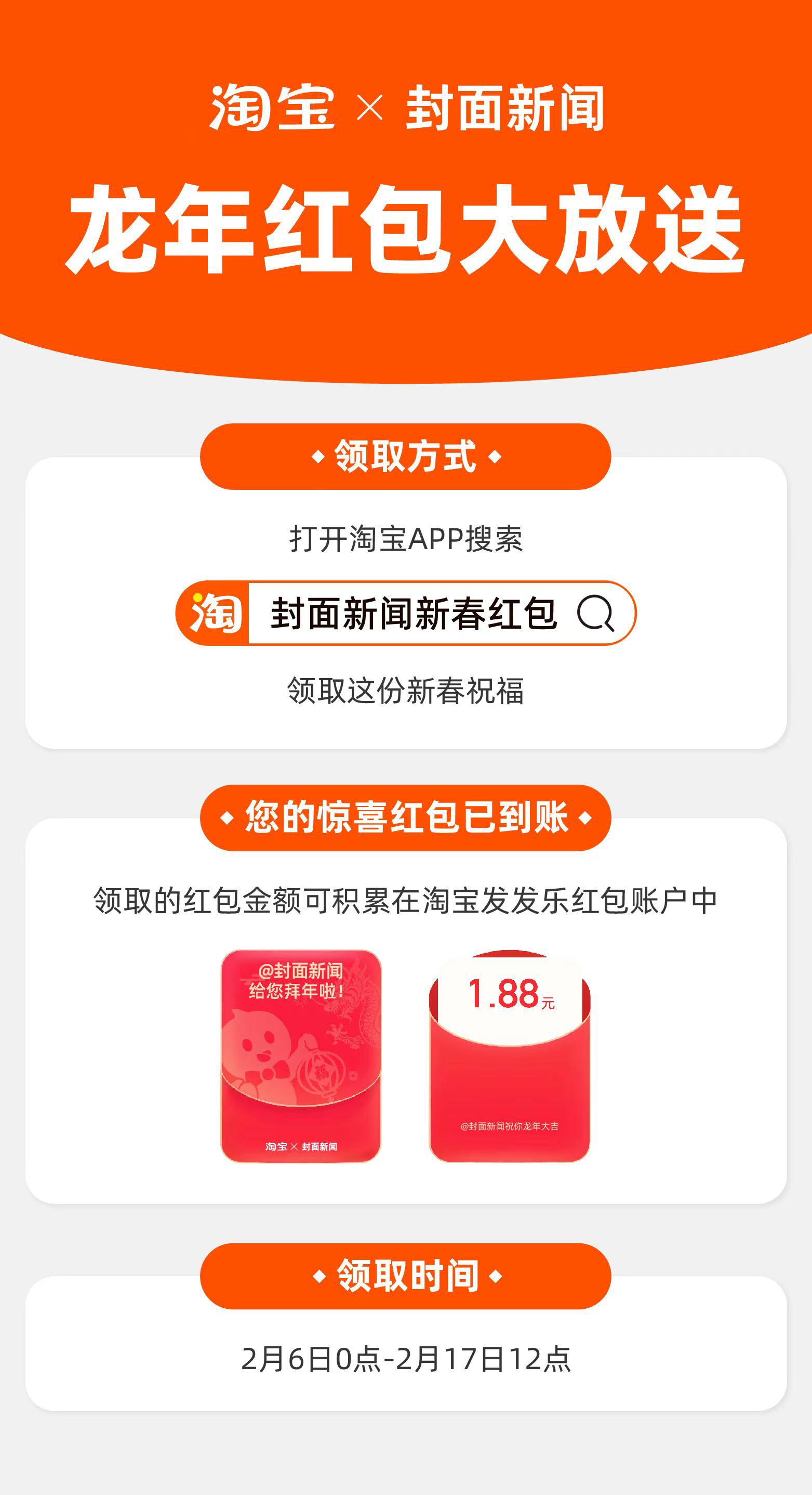 2月5日至2月17日期间,上淘宝搜索「封面新闻新春红包」,就可以获得封面新闻联合淘宝给粉丝准备的专属福气(总体红包额度10万封顶,领完即止)!