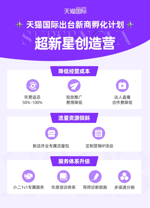 近日,天猫国际推出新商孵化计划 “超新星创造营”,投入上亿基金,推出减免年费,赠送直播流量等新店开业服务和年度成长计划,预计3年内扶持1000个全球新品牌,从品类新星成长为超新星品牌。