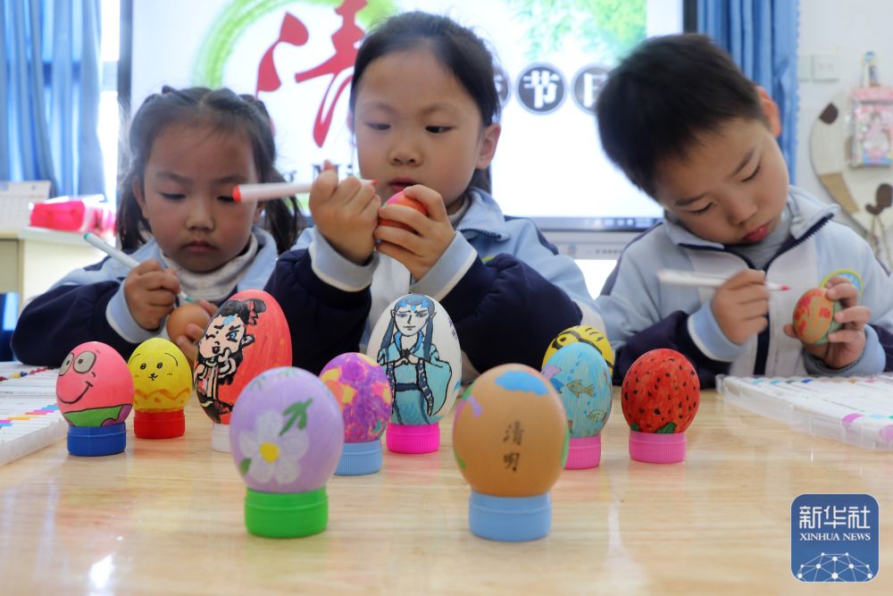 ↑ 4月1日,山东省高密市金苹果幼儿园的孩子们在绘彩蛋。新华社发(李海涛摄)