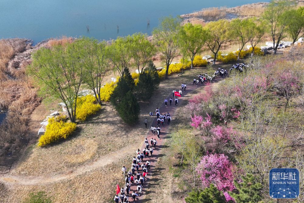 ↑ 4月3日,山东省高密市第五中学的中学生在胶河国家湿地公园参加踏青远足活动(无人机照片)。新华社发(李海涛摄)