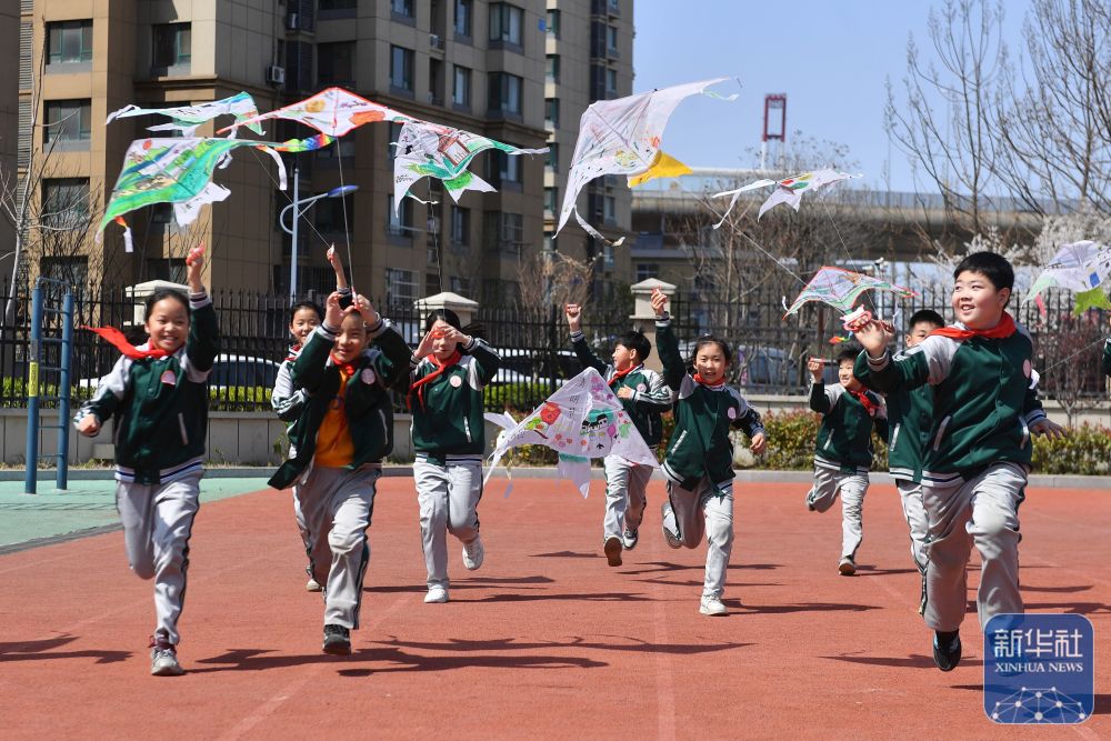 ↑ 4月2日,学生们在山东省青岛市市北区普新小学开展的民俗迎清明活动上放风筝。新华社发(王海滨摄)