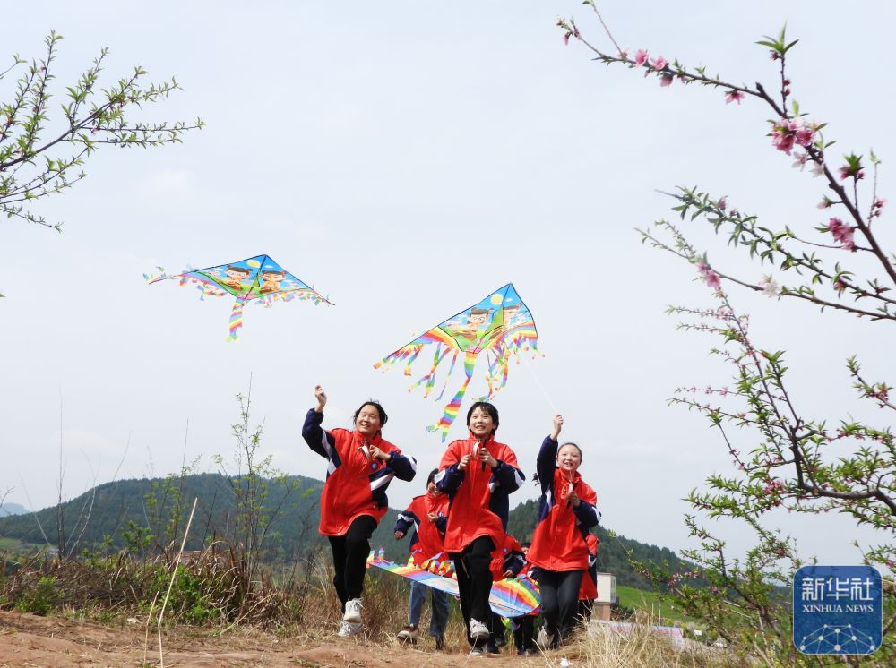 ↑ 4月3日,四川省达州市渠县新市镇第一小学学生在阳光大课间放风筝。新华社发(邓良奎摄)