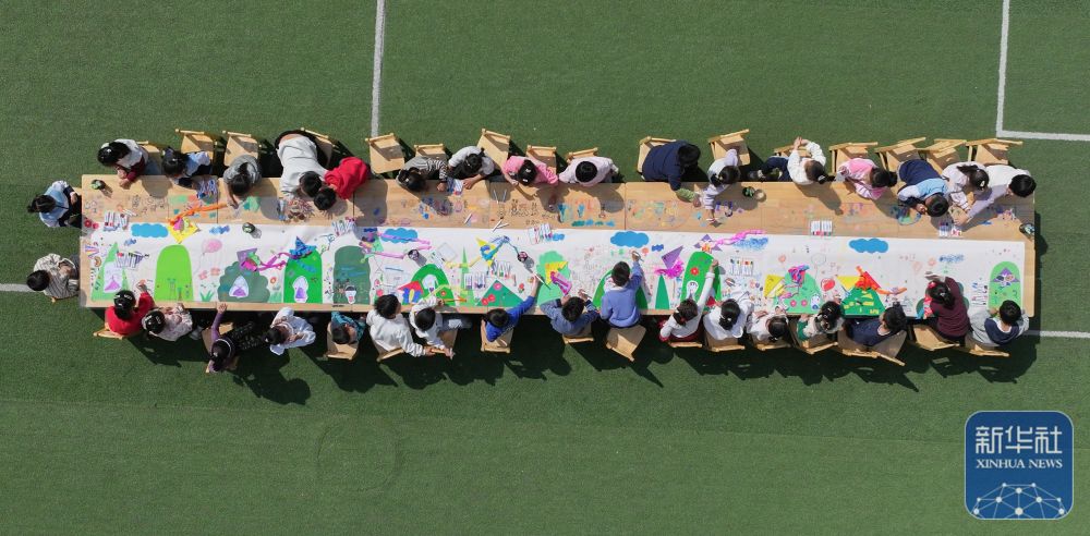 ↑ 4月3日,山东省邹平市高新街道中心幼儿园的小朋友在绘制清明长卷(无人机照片)。新华社发(董乃德摄)