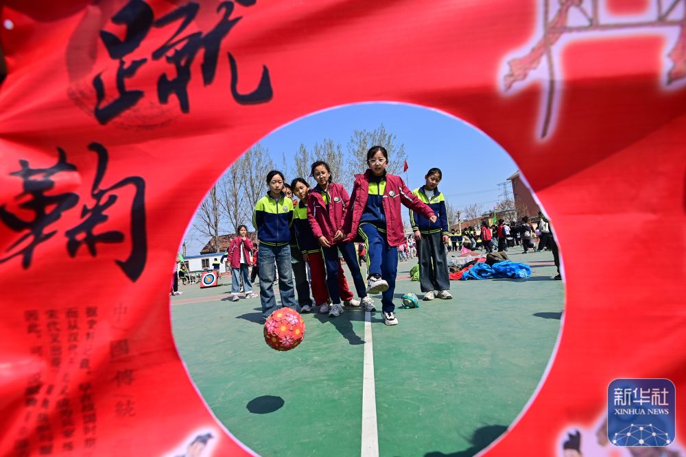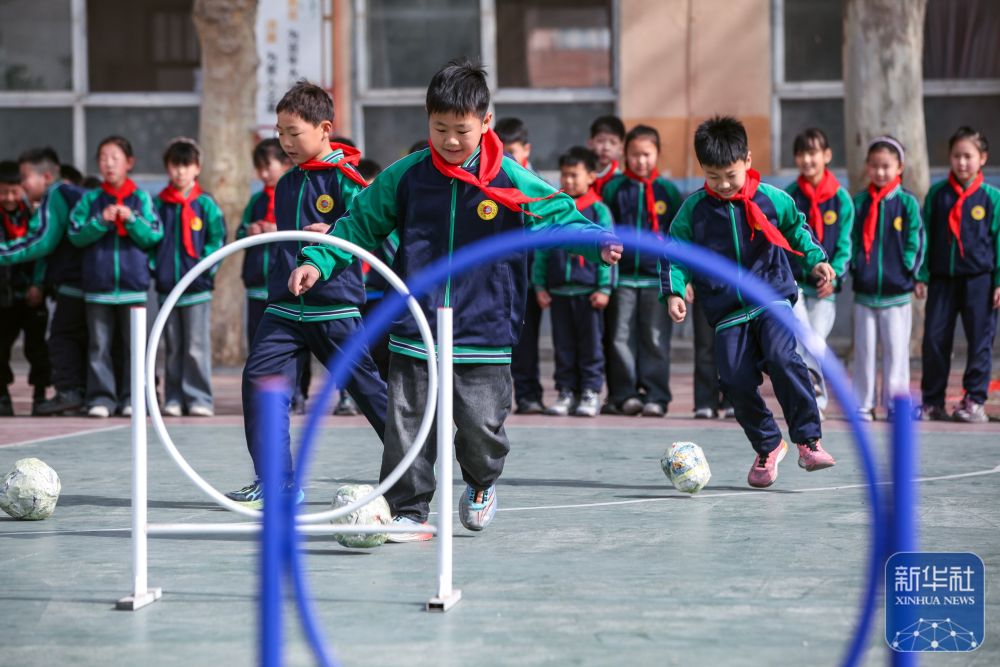 ↑ 4月3日,在河南省焦作市博爱县清化镇街道七街小学,学生们在体验蹴鞠。新华社发(程全摄)