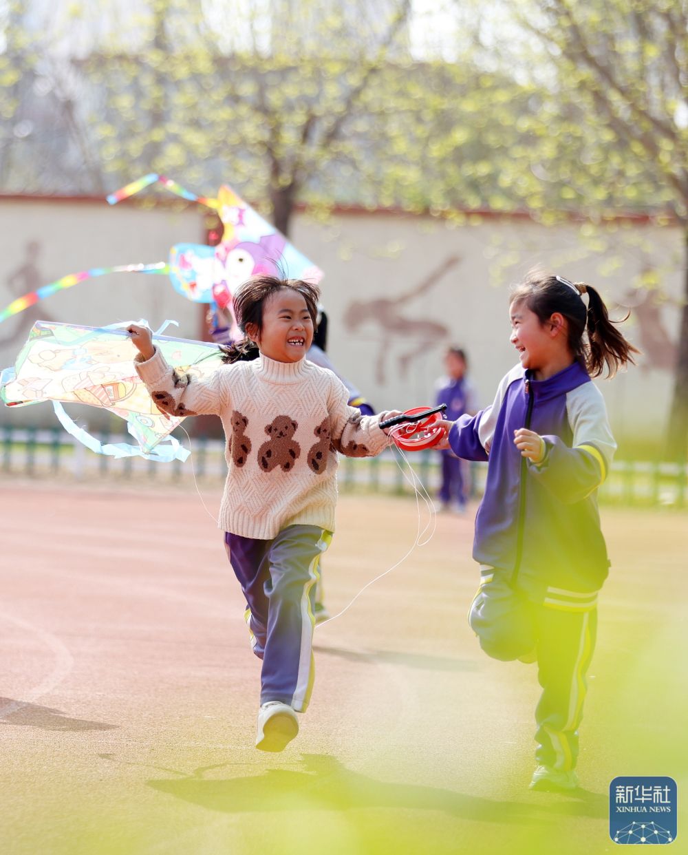 ↑ 4月3日,山东省临沂市郯城县第一实验小学学生在操场上放风筝。新华社发(张春雷摄)