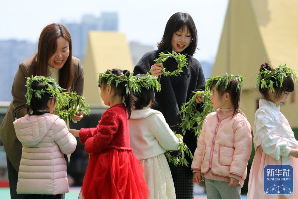 ↑ 4月3日,四川省乐山市瑞锦幼儿园小朋友和老师一起制作柳帽。新华社发(李华时摄)