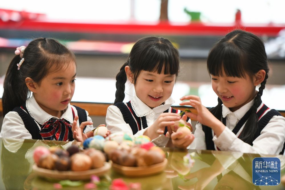 ↑ 4月3日,在浙江省金华市婺城小学,小学生在制作清明花草蛋。新华社发(时宽兵摄)