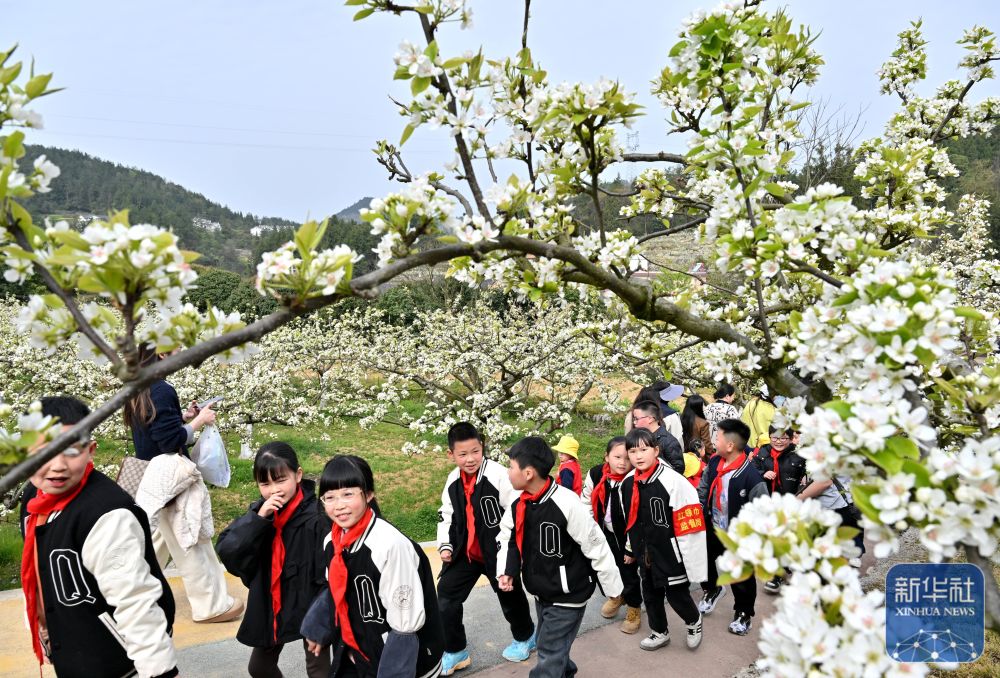 ↑ 4月2日,湖北省宣恩县清江外国语学校的师生在黄坪村的梨园里徒步。新华社发(宋文摄)