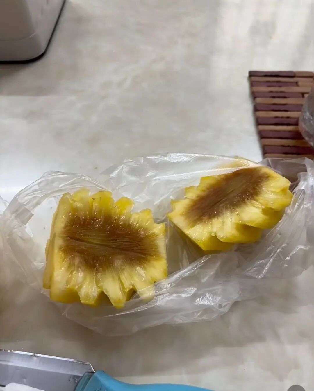 最近是菠萝上市的季节,有时候买菠萝时会遇到菠萝果芯发黑的情况,一些卖家说这种菠萝是“糖心菠萝”,更好吃,不少人信以为真。
