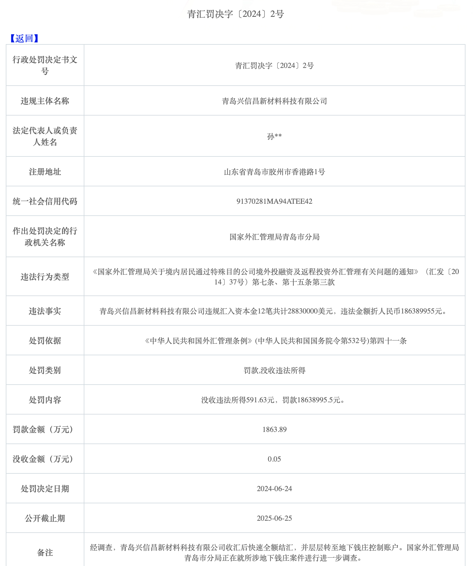 青汇罚决字〔2024〕2号罚单显示,青岛兴信昌新材料科技有限公司(简称兴信昌)因违反规定将外汇汇入境内,违反了《国家外汇管理局关于境内居民通过特殊目的公司境外投融资及返程投资外汇管理有关问题的通知》(汇发〔2014〕37号)第七条、第十五条第三款。由此,该局对涉事公司作出上述处罚。