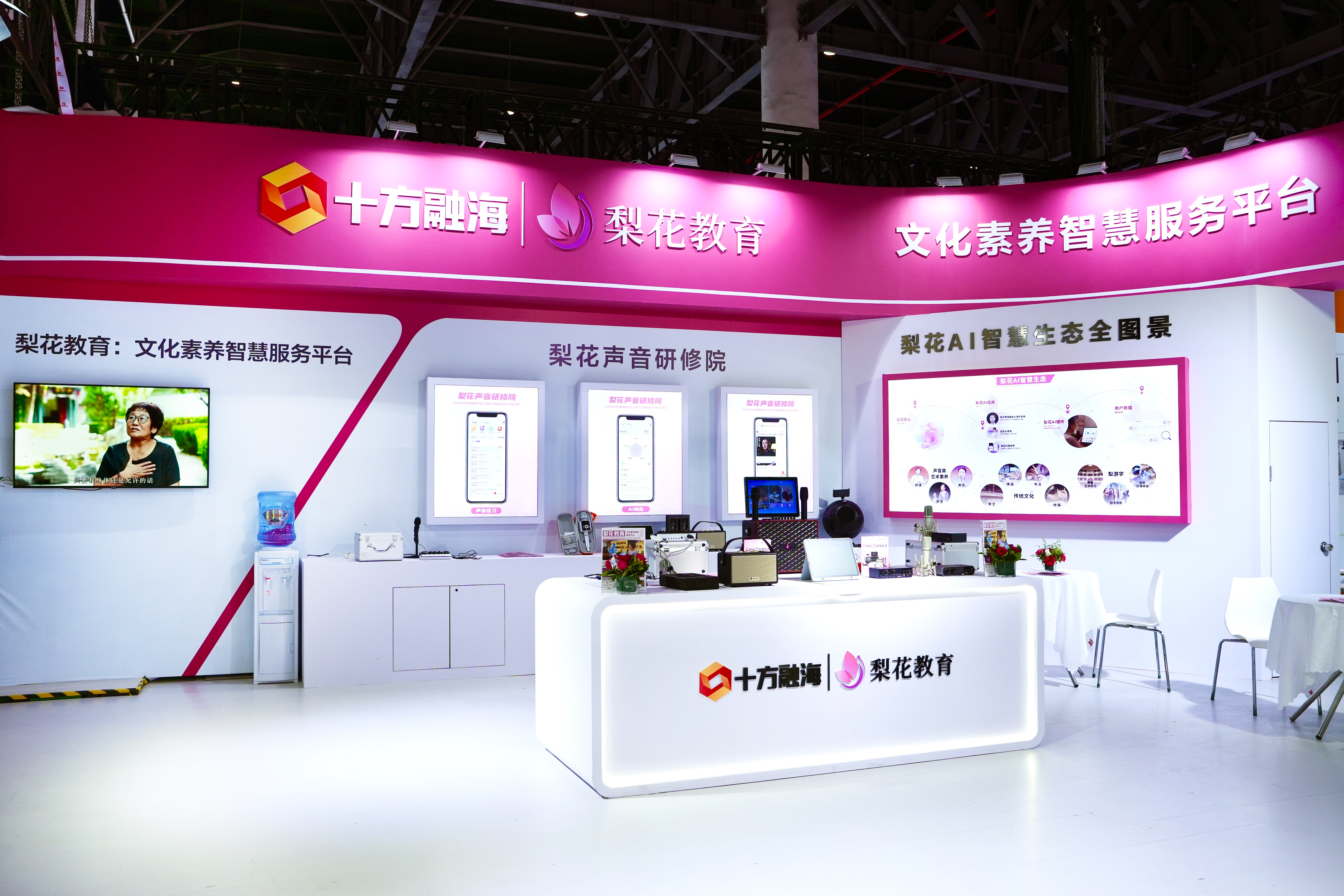 在主场馆,十方融海旗下文化素养智慧服务平台“梨花”展台集体展出8款AI声学硬件产品,按“1+2+3”生态矩阵陈设,分别对应乐龄用户入门学、场景练、专业创的成长路径。