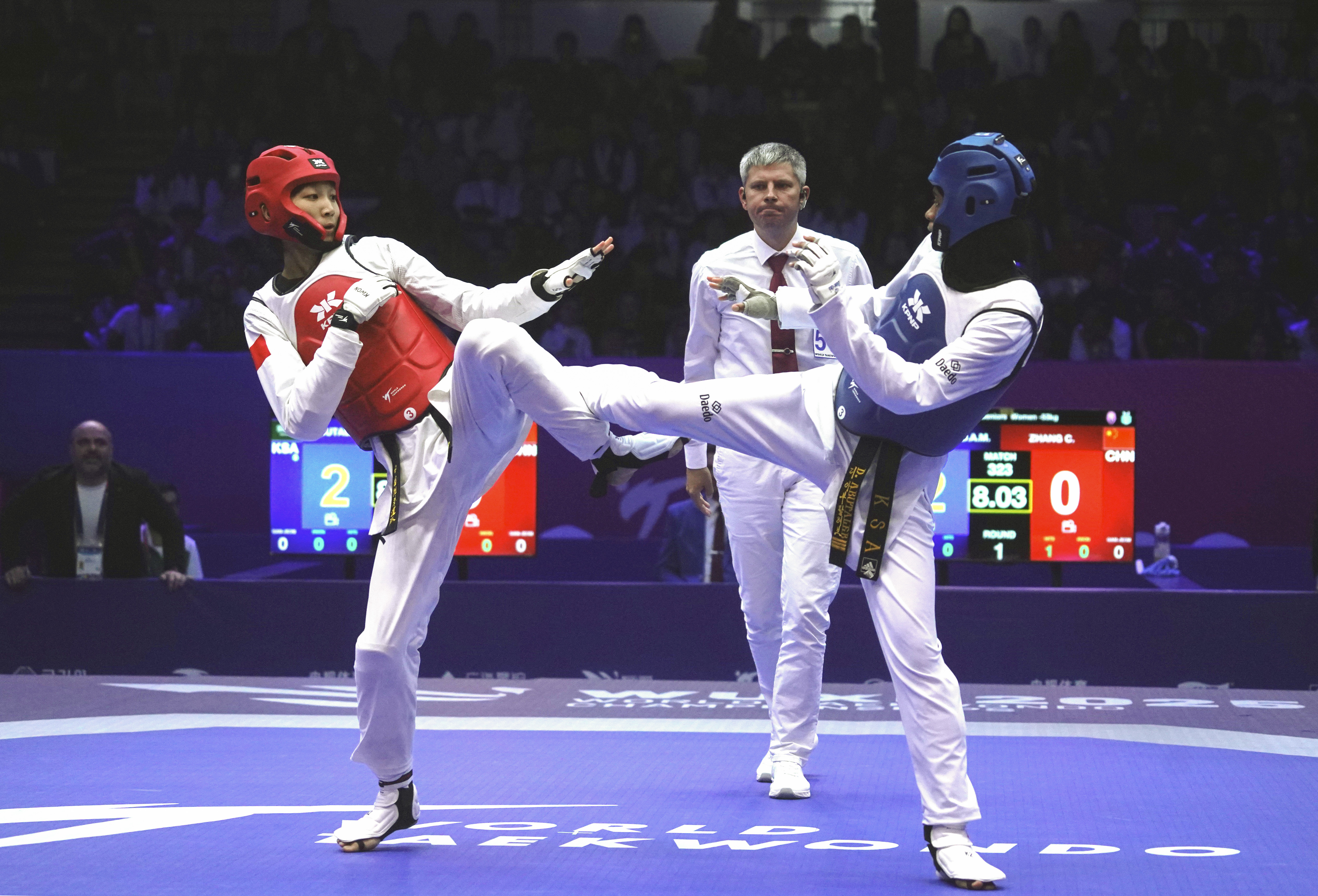 图为10月30日在江苏无锡举行的一场2025年世界跆拳道锦标赛比赛。新华社发(刘臻睿 摄)