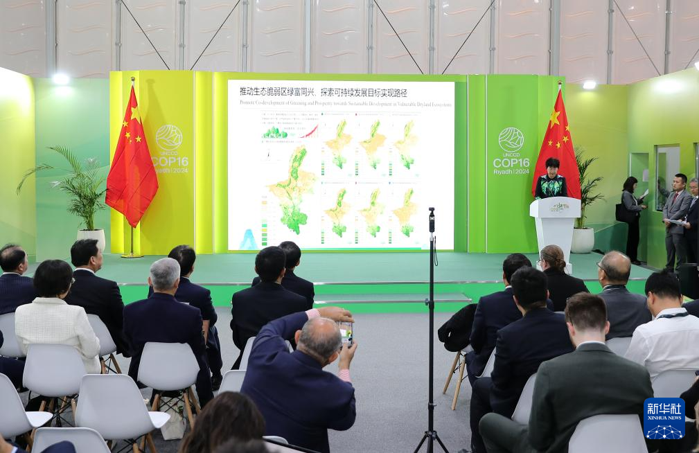这是12月4日在沙特阿拉伯利雅得《联合国防治荒漠化公约》第十六次缔约方大会(COP16)中国馆拍摄的边会现场。《联合国防治荒漠化公约》第十六次缔约方大会(COP16)中国馆4日下午举办首场边会,向全球介绍荒漠化防治的“宁夏经验”。新华社记者 王东震 摄