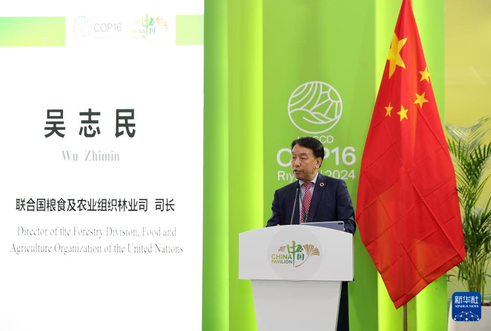 12月4日,在沙特阿拉伯利雅得,联合国粮食及农业组织林业司司长吴志民在《联合国防治荒漠化公约》第十六次缔约方大会(COP16)中国馆举办的边会上发言。新华社记者 王东震 摄