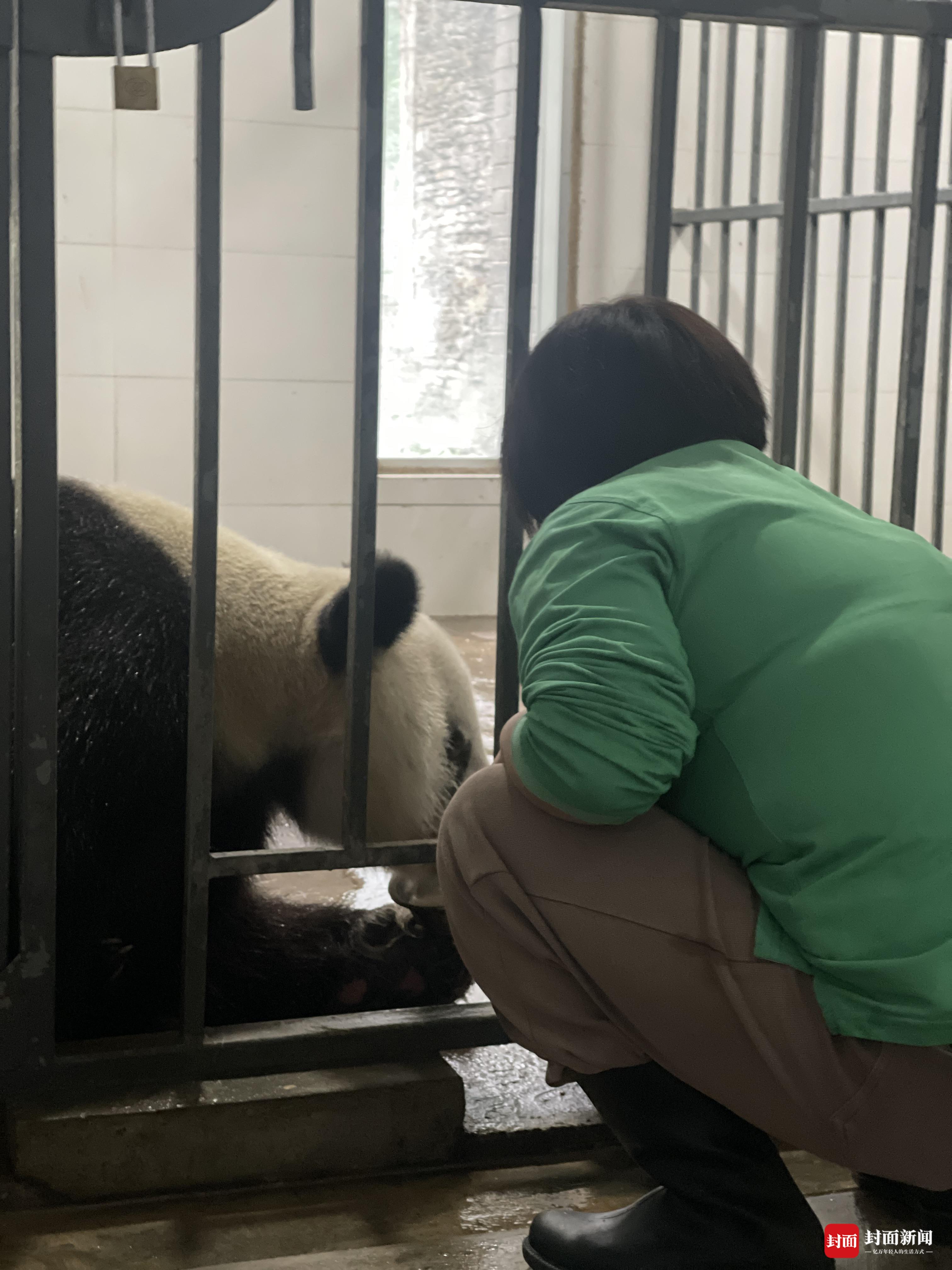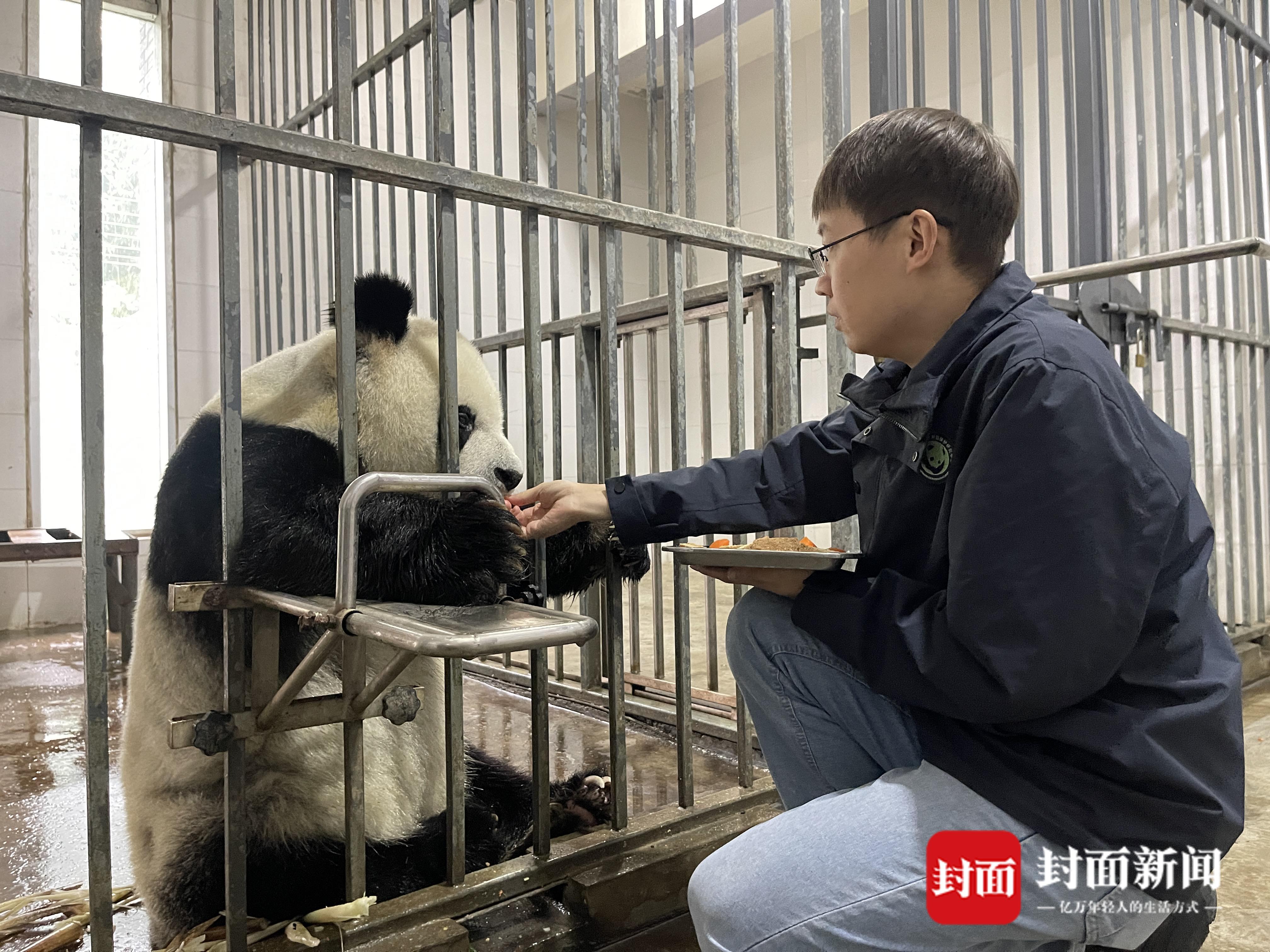 徐娅琳正在喂大熊猫“海子”吃盆盆奶。“海子”31岁了,来自野外的它曾创下大熊猫界最高龄产妇的记录。