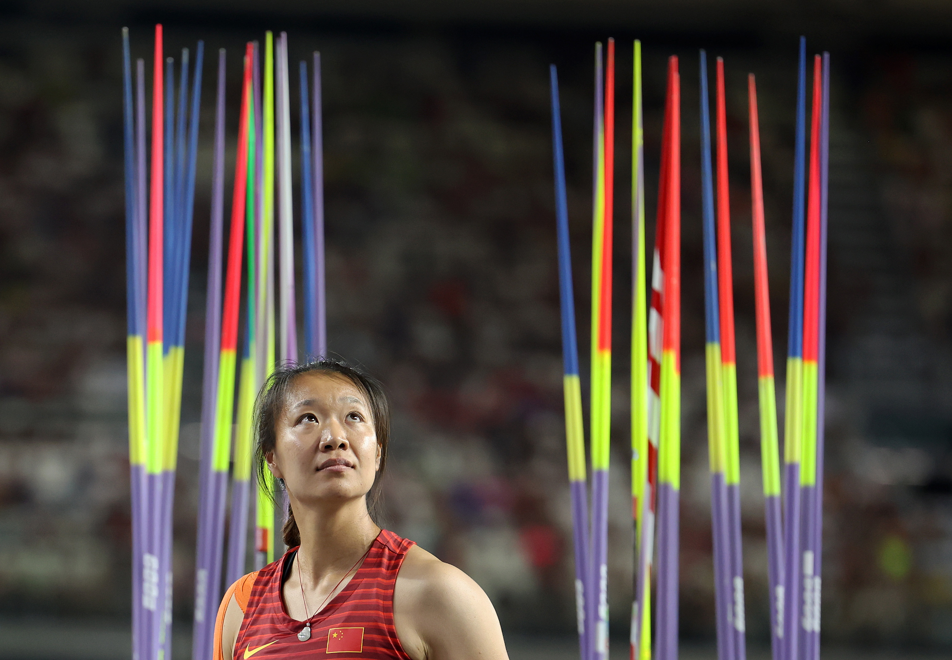 2022年7月22日,在美国俄勒冈州尤金市举行的2022世界田径锦标赛女子标枪决赛中,刘诗颖在试投。新华社记者吴晓凌摄