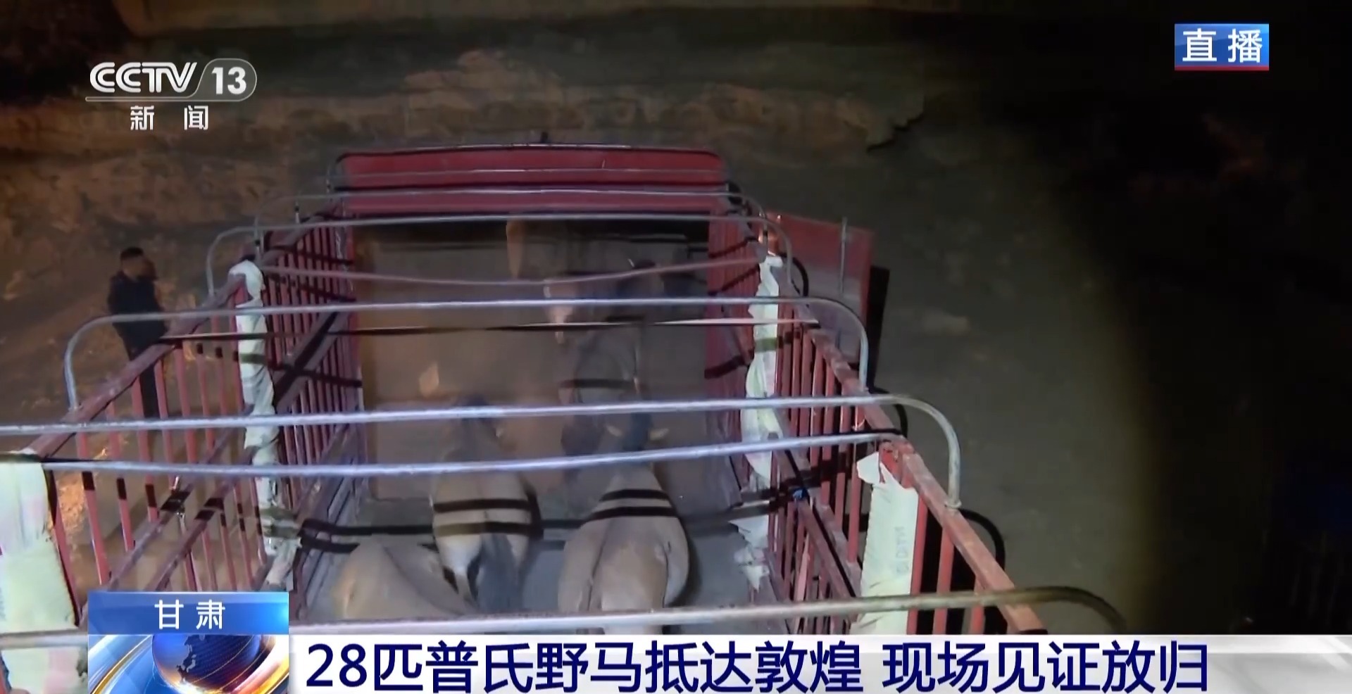普氏野马保留着马属动物的原始基因,是目前世界上最濒危的大型野生动物之一,被列为国家一级保护动物。9月15日上午,28匹普氏野马从位于甘肃武威的濒危动物保护中心出发,首次尝试以远距离散装的形式,放归到敦煌西湖国家级自然保护区,沿途跨越1030公里,相当于穿越整个河西走廊。经过将近20个小时的奔波,今早6点左右,这批普氏野马抵达了放归点,工作人员稍作检查,即将放归。