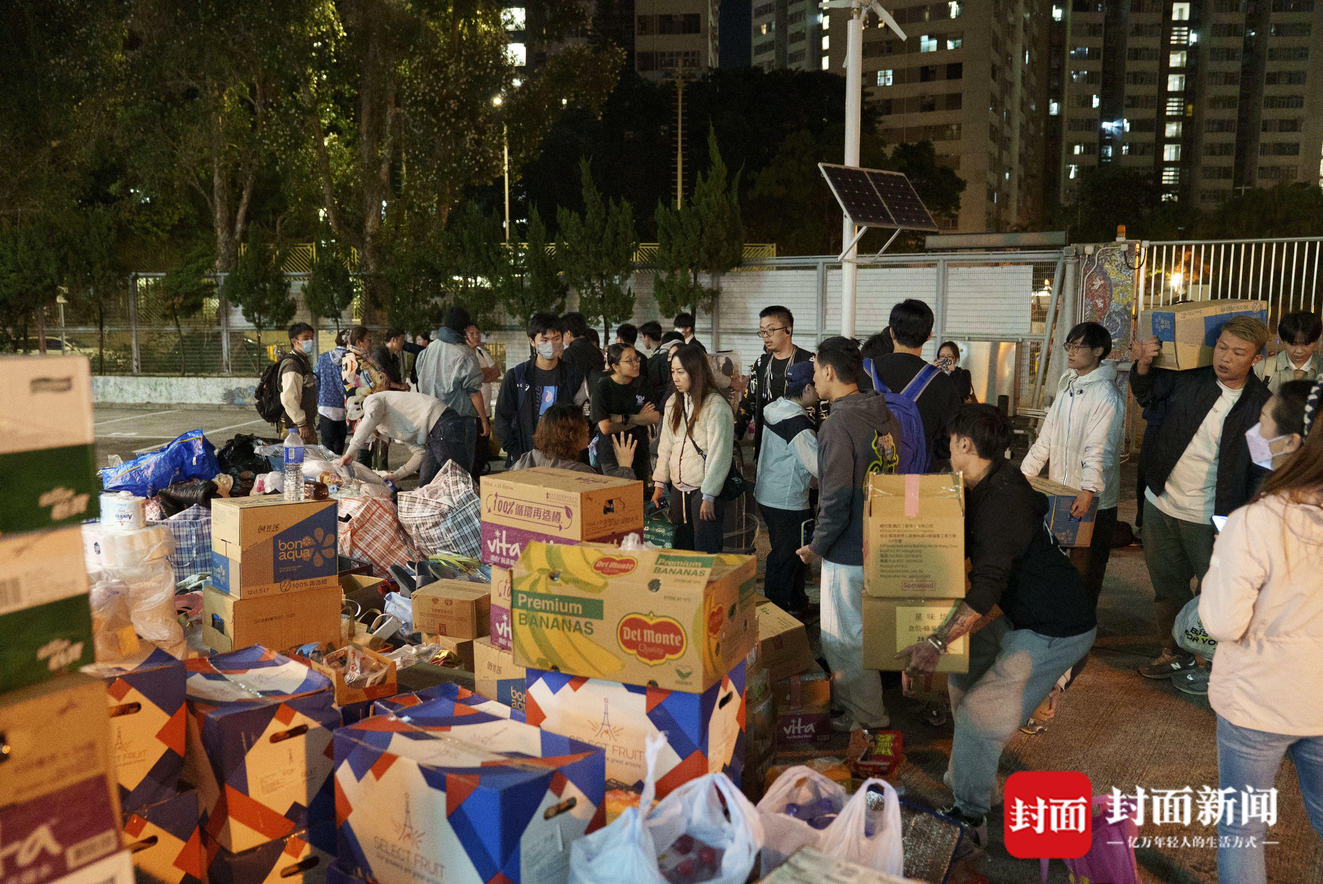 封面新闻记者在宏福苑附近的临时安置点看到,有热心市民不断扛着成箱的饮用水、干粮到来,有人则提着大包小包的被褥、毛毯、厚外套、充电宝。住在元朗区的陈先生说,事发后他挨个给安置点打电话,晚上9点下班后直接开车去采购物资,来来回回已经跑了4个点位运输,“能帮就帮,公民责任。”