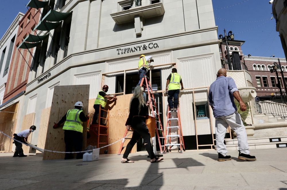 2020年11月2日,美国洛杉矶县贝弗利山市商业区的商家将店铺门窗封上。为应对当时美国大选可能出现的抗议或骚乱,贝弗利山市不少商业区加强防护和安保。新华社发