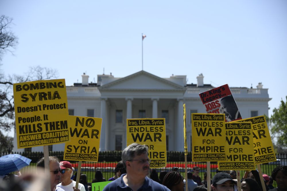 2018年4月14日,在美国华盛顿白宫北侧,人们手持标语抗议对叙利亚进行军事打击。新华社记者 杨承霖 摄