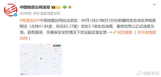新疆阿克苏拜城5.1级左右地震 新华社 2024-04-10 19:07 43153 中国地震台网自动测定:4月10日18时57分在新疆阿克苏地区拜城县附近(北纬41.84度,东经82.37度)发生5.1级左右地震,最终结果以正式速报为准。 评论 56 阿拉萌萌 2024-04-10 发表于四川 愿平平安安 希腊花 2024-04-10 发表于四川 希望所有人都没事,平安! fm_16664 2024-04-10 发表于四川 愿天佑新疆,平安度过这次危机。 查看更多