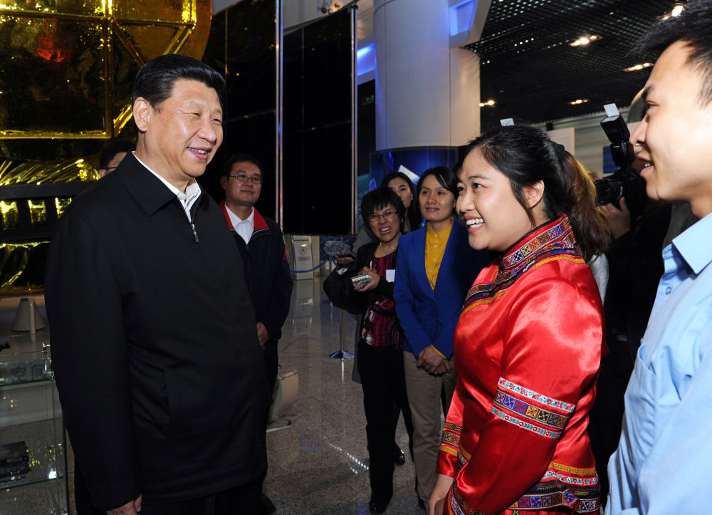 2013年5月4日,习近平来到中国航天科技集团公司中国空间技术研究院,同各界优秀青年代表座谈并发表重要讲话。这是座谈会前,习近平和在展厅参观的优秀青年代表交谈。