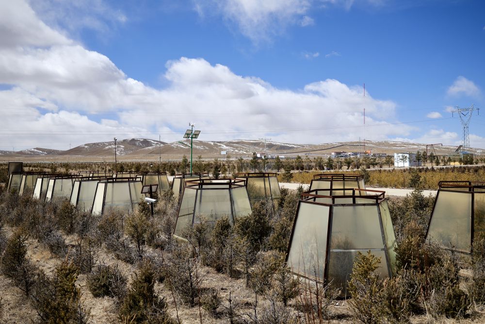 西藏那曲地区城镇植树关键技术研发与绿化模式示范项目示范基地中的顶开式滤光温室。新华社记者 周昱龙 摄