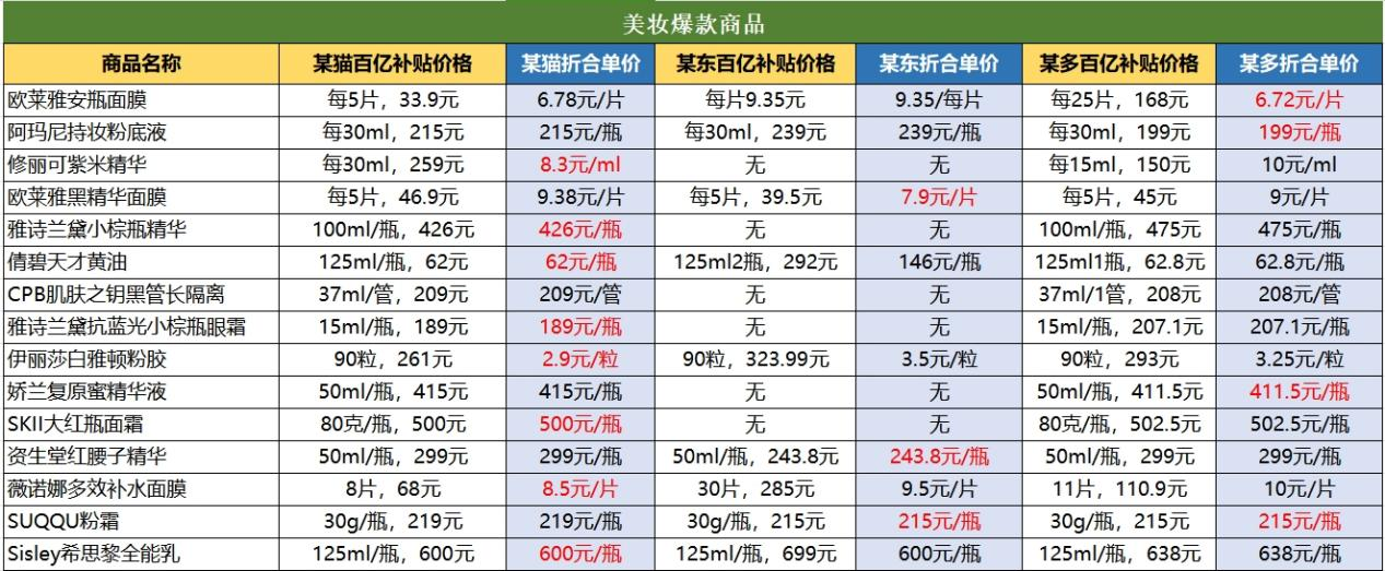 除了吃喝,每年双11必备的“美妆护肤”今年也拿出了最“能打”的价格,今年的美妆护肤在价格上有多卷,还得看各家的百亿补贴力度。记者精选了几款当下热门的美妆产品,通过对比发现,天猫上修丽可紫米精华、雅诗兰黛小棕瓶、倩碧天才黄油、SK-II大红瓶面霜等多个热门单品,折后单价全网最低,其中修丽可紫米精华面膜单片仅需9.38元,雅诗兰黛抗蓝光小棕瓶仅需189元/瓶,几乎半价就可拿下;而阿玛尼持妆粉底液、娇兰复原蜜精华液等拼多多相对便宜,几乎是日常的六七折价格。欧莱雅黑精华面膜、资生堂红腰子精华则在京东有价格优势。