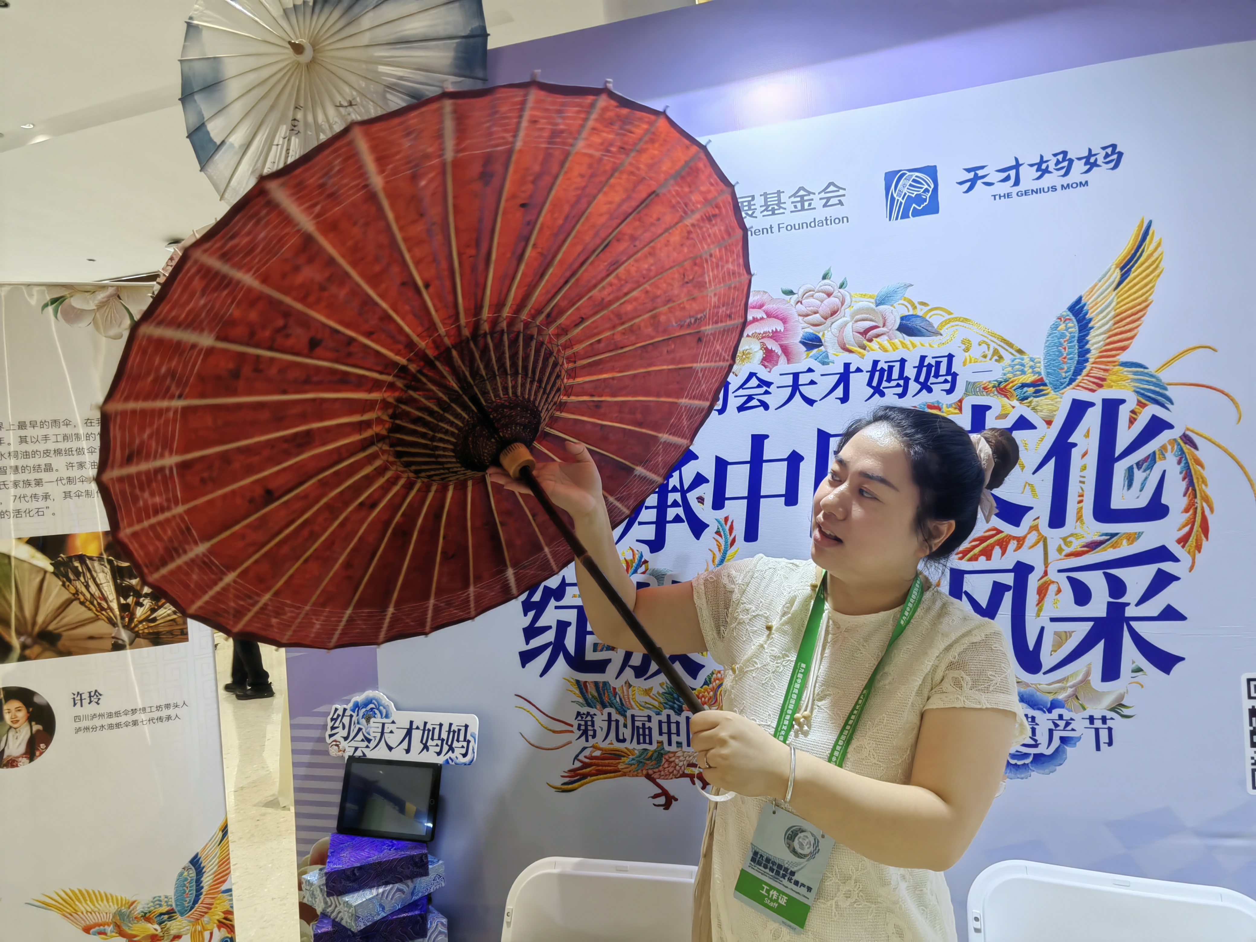 一边整理色彩斑斓的油纸伞,一边和市民游客交流,四川泸州油纸伞梦想工坊带头人许玲忙得不亦乐乎。“好多人来了解油纸伞的制作技艺。”许玲说,希望借此机会让更多人了解这门独特的技艺。