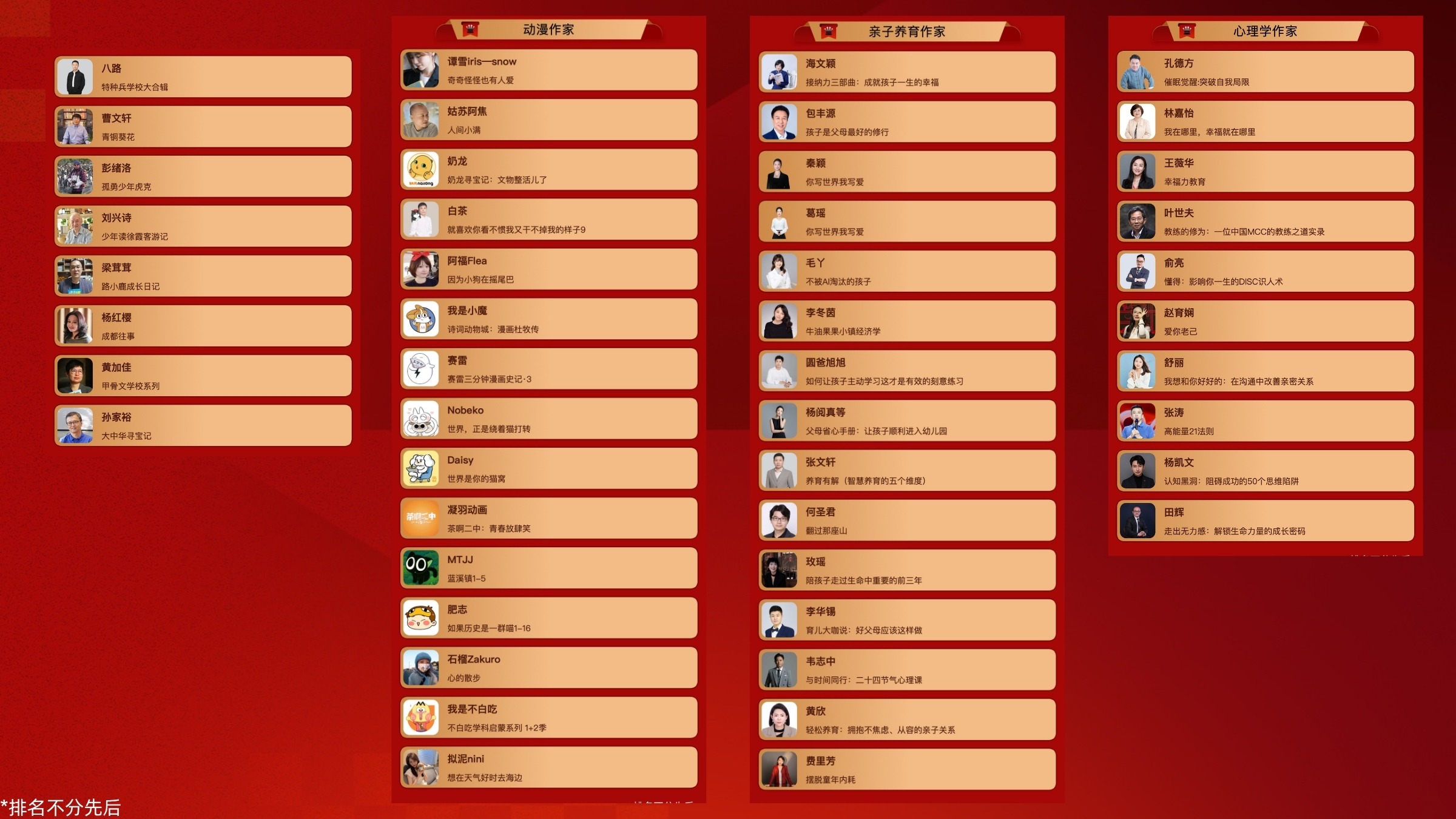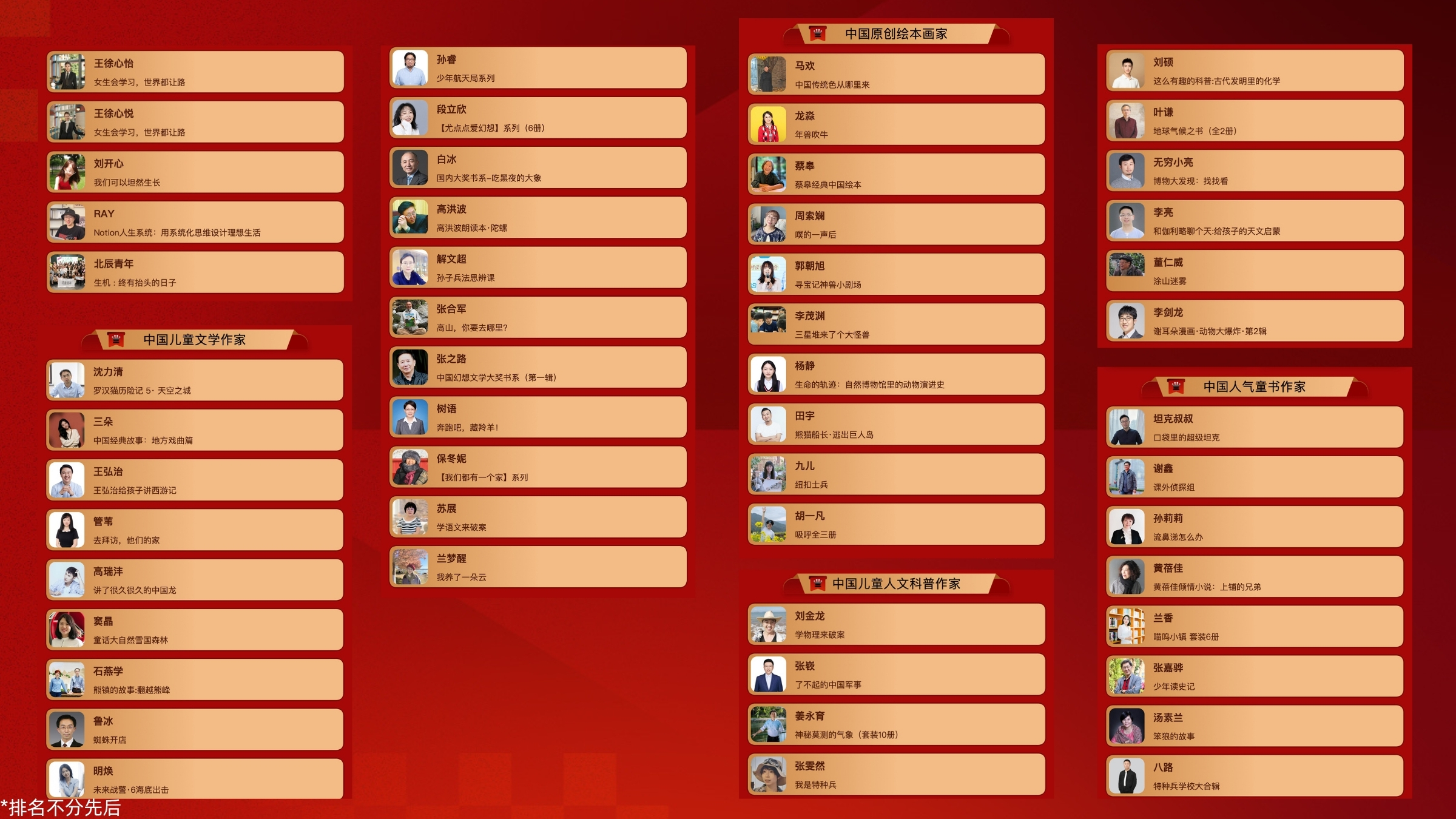 中国人气童书作家榜单群星熠熠,曹文轩、杨红樱、八路、汤素兰、坦克叔叔、《大中华寻宝记》作者孙家裕、谢鑫、黄蓓佳、黄加佳等读者熟悉的作家悉数入选。中国儿童文学作家榜单同样汇聚了白冰、高洪波、张之路、保冬妮、孙睿、段立欣等一批深受小读者喜爱的作家,充分展现了中国原创儿童文学的强大创作实力。中国原创绘本画家榜单中,蔡皋、九儿、龙淼等创作者的作品为小读者们搭建了通往艺术殿堂的桥梁。中国儿童人文科普作家榜单中,无穷小亮、姜永育、张嵚等人以生动有趣的科普读物,培养着青少年对科学探索的浓厚兴趣。