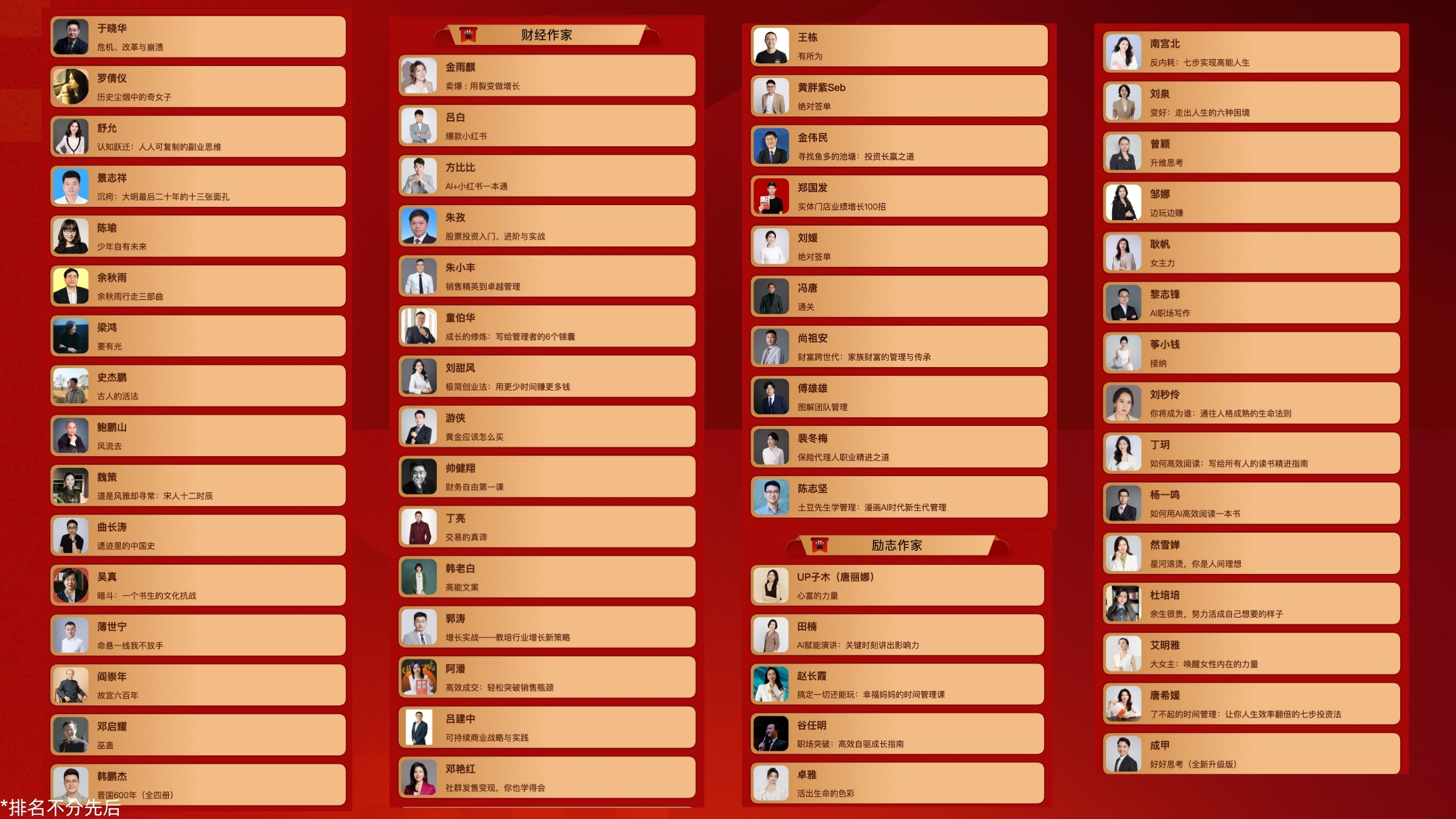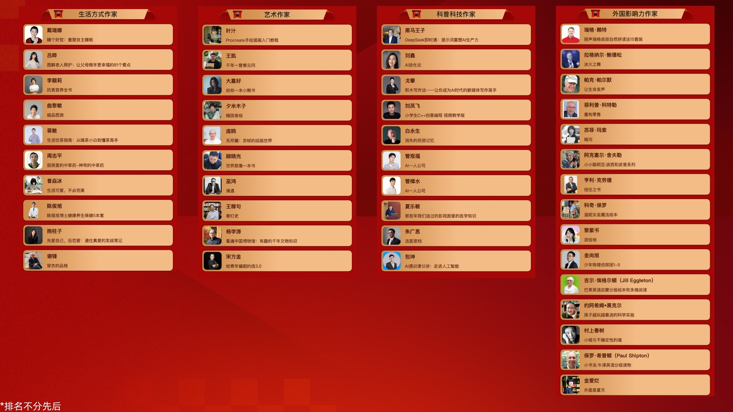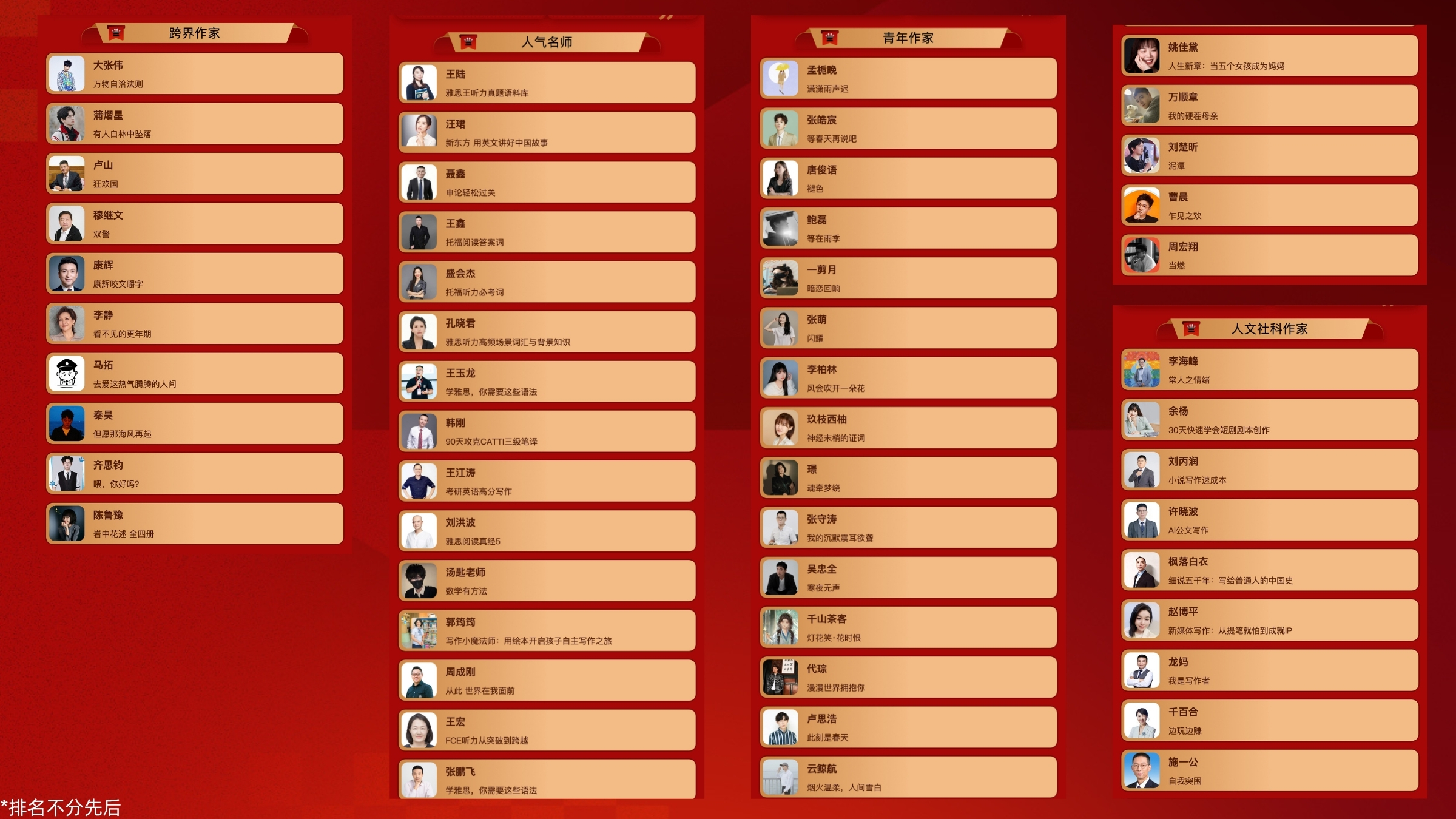 本届评选涵盖的19个榜单。在文学作家领域,李筱懿、刘同等作家凭借丰沛的文学创作再次入选。青年作家榜则涌现出卢思浩、张皓宸、千山茶客等备受年轻读者喜爱的优秀创作者。在人文社科作家领域,著名文化学者余秋雨、施一公、梁鸿、鲍鹏山等学者入选。财经作家榜单中,知名作家冯唐跨领域入选。