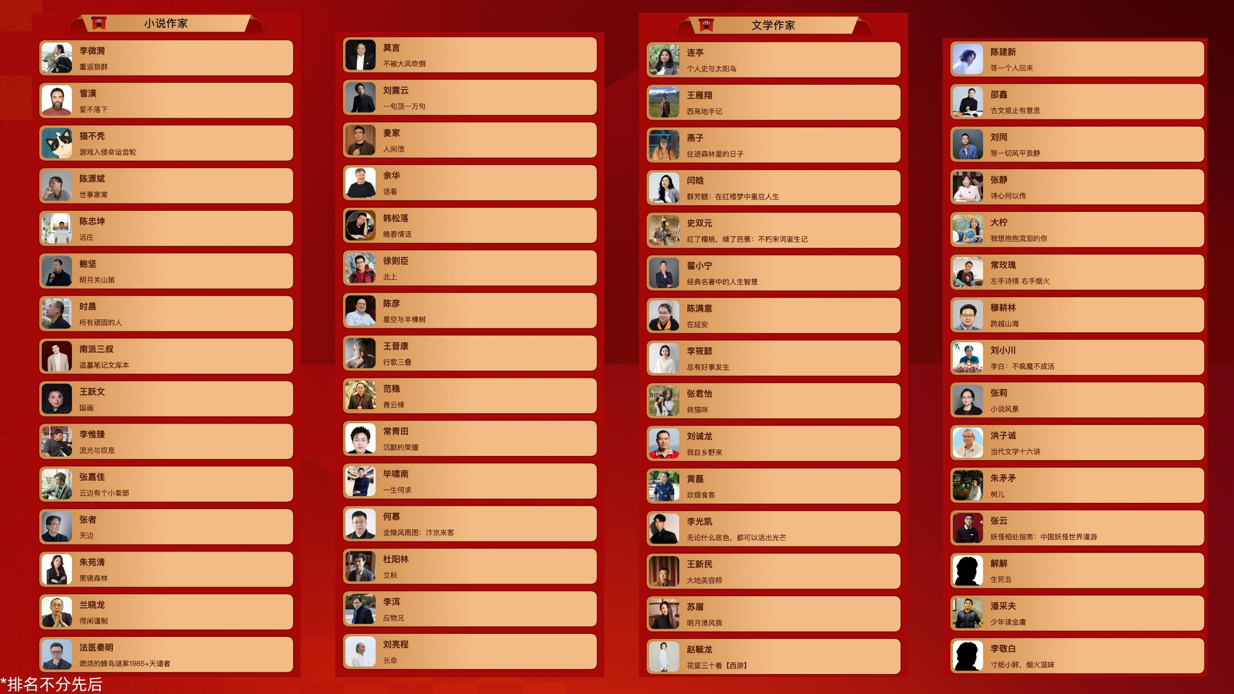 本届小说作家榜共评选出30名作家,李微漪凭借其大热作品《重返狼群》脱颖而出,小说作家榜同时汇聚了莫言、余华、刘震云、麦家、徐则臣等中国当代文学的重量级作家,以及南派三叔、法医秦明等在通俗文学领域拥有庞大读者群的实力派作家。此外,雪漠、王跃文、张嘉佳、兰晓龙等同样榜上有名,展现出中国文学创作传承有序、多元共生的繁荣格局。